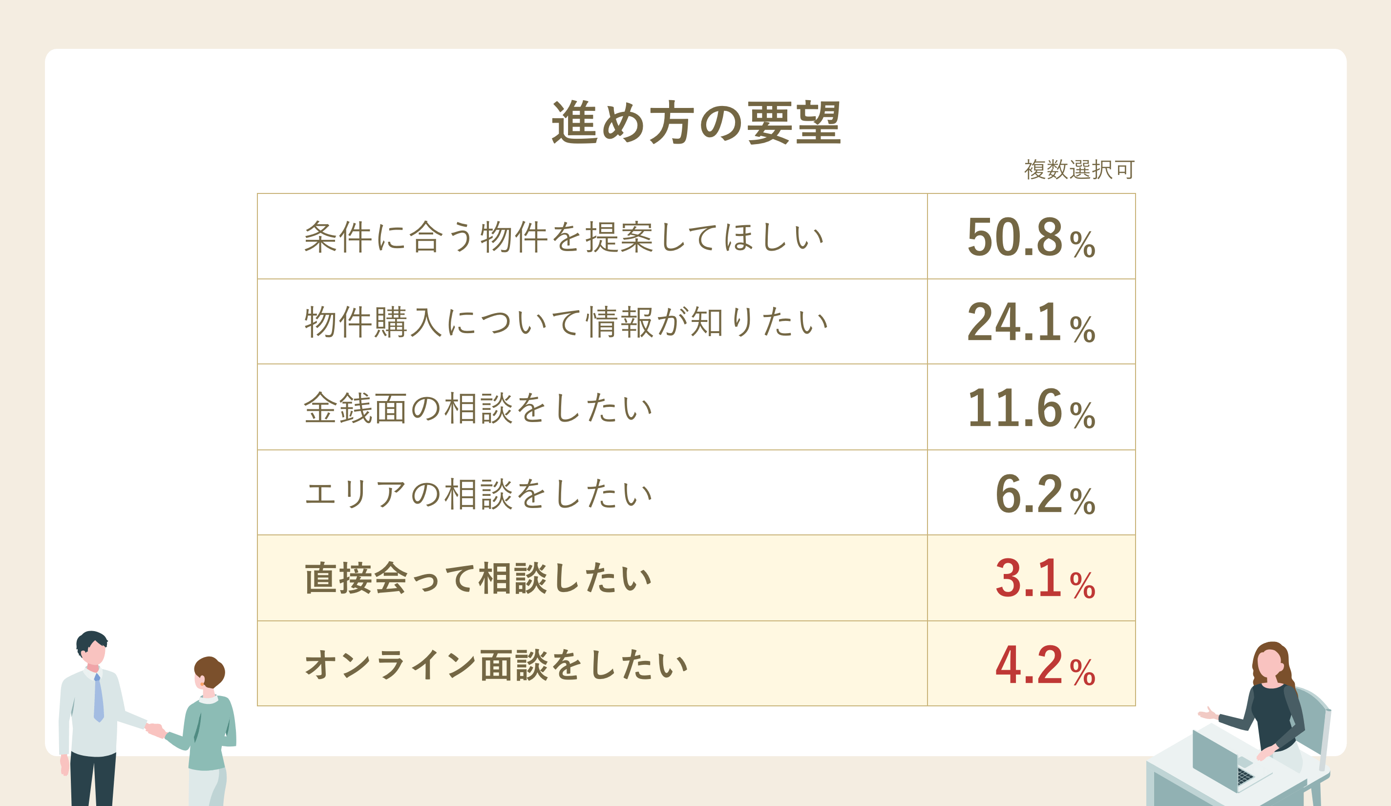 物件を探し始めるにあたって不動産会社に期待していることとしては「条件に合う物件を提案してほしい」という方が約半数となりました。一方で、「直接会って相談したい」「オンライン面談をしたい」といったまずは話をしていきたいと考えている会員様もいらっしゃいます。