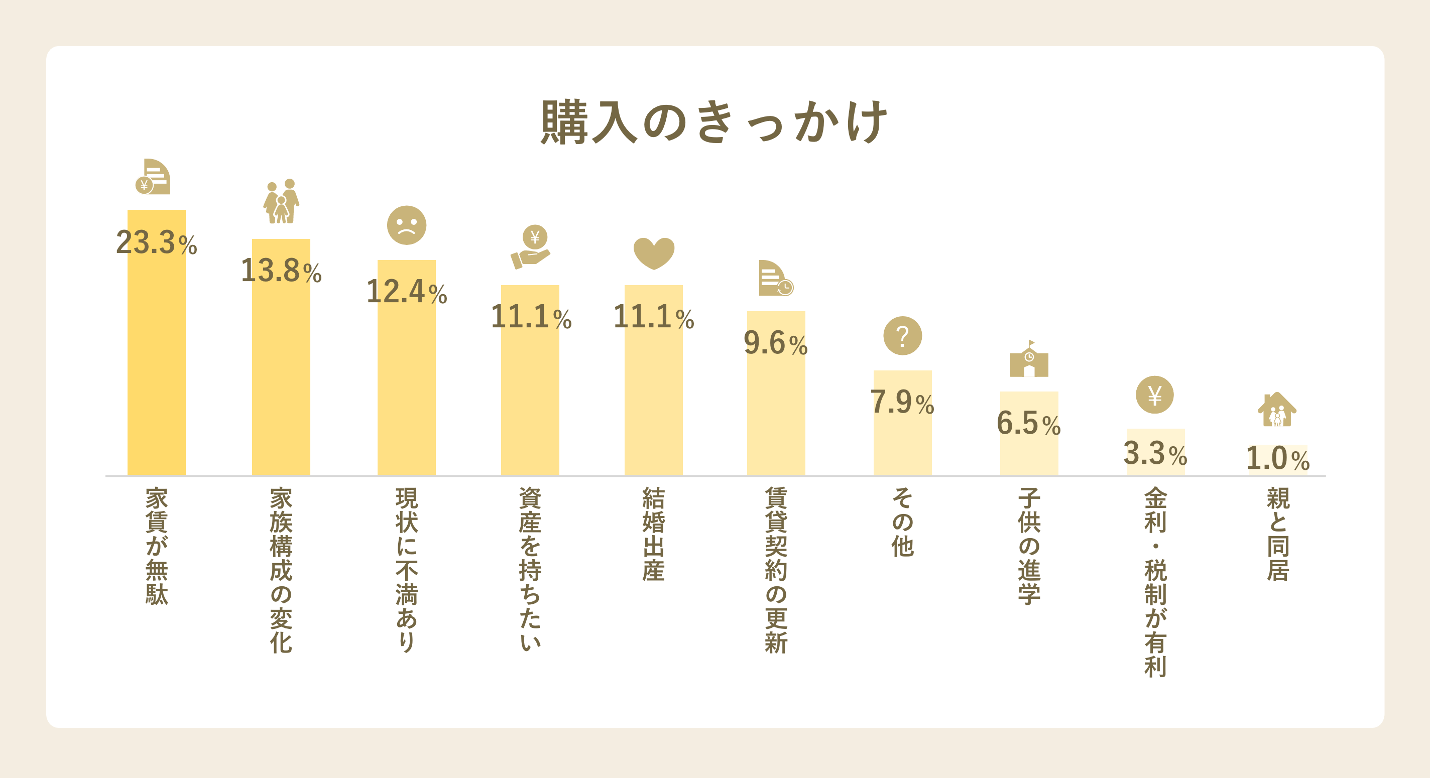 物件購入を検討し始めた方の多くが「家賃が無駄」や「資産を持ちたい」、「金利・税制が有利」といった経済的な面で購入を検討しておりますが、家族構成の変化や結婚・出産、子供の進学などの生活面での変化を機に物件を探し始める方が多いようです。