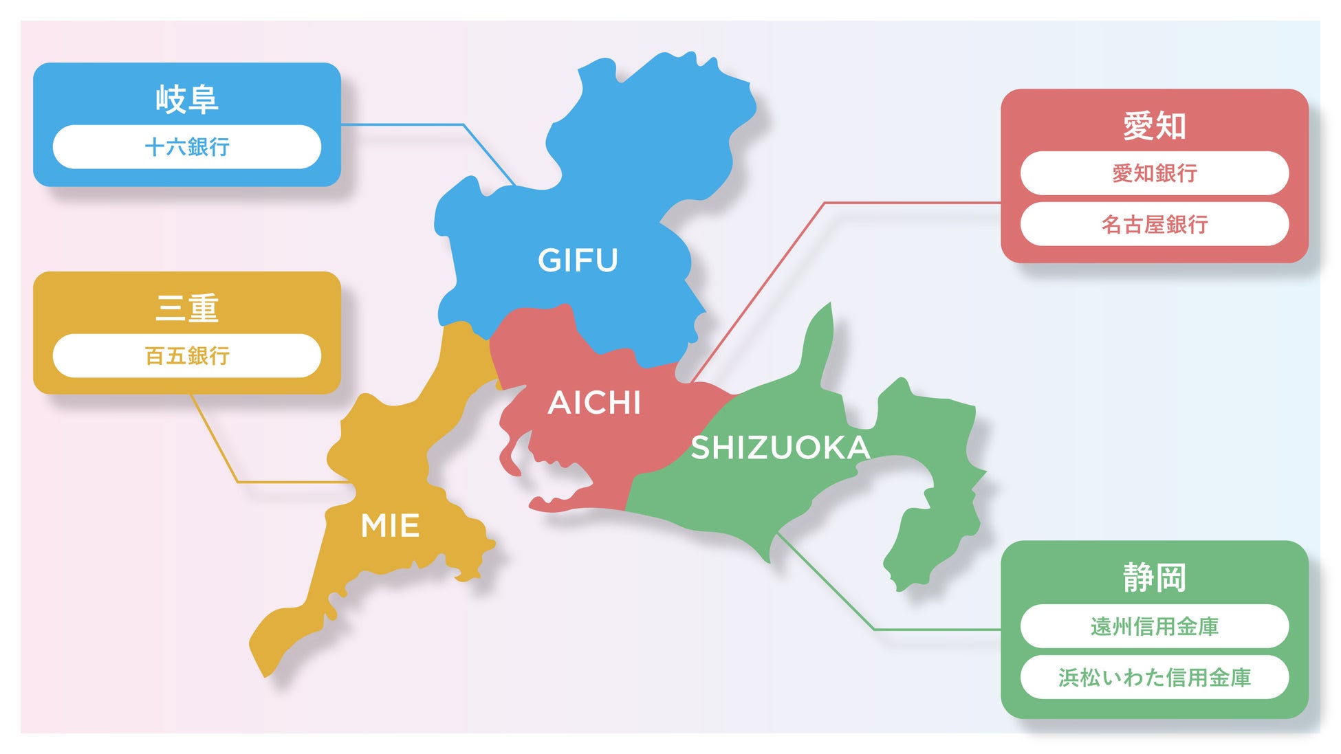 東海エリアでは以下の地方銀行(一例)と提携し、生産者様やサプライヤー様、利用企業様のご紹介等を通じ、共に地域活性に向けて取り組んでいます。
