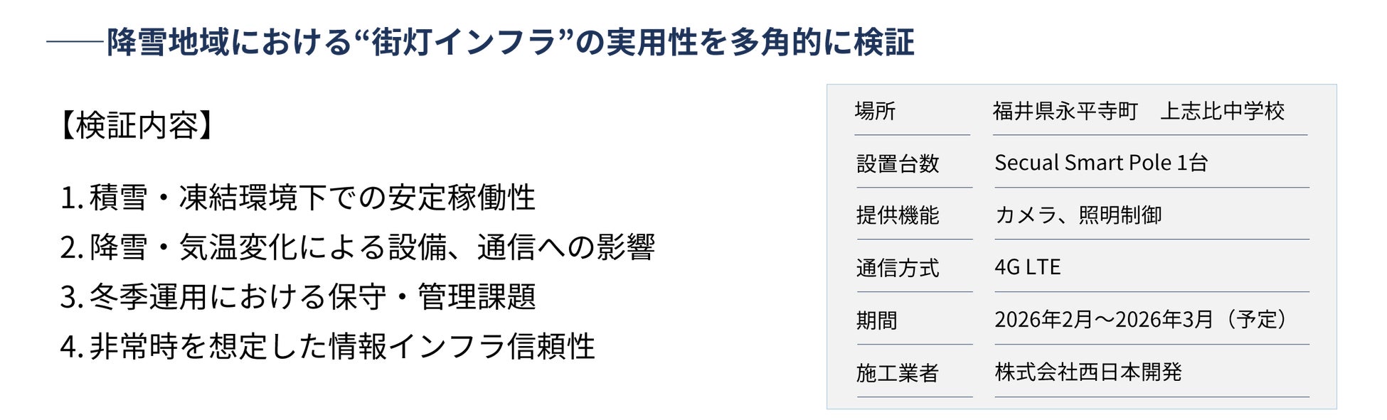 本プロジェクトの第1弾として、福井県永平寺町の協力のもと、上志比中学校において、既設の街灯をSmart Poleに交換し、登下校時の防犯強化と積雪や凍結を伴う環境下での検証を実施します。