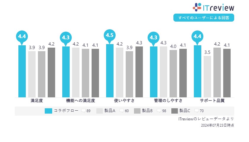 「ITreview カテゴリーレポート」とは、ITreviewの各カテゴリーに掲載されている製品のうち、30件以上のユーザーレビューを集めた製品について、そのレビューの情報から、各製品の満足度や機能の満足度スコア、価格、実装に関する情報、ユーザービリティ(使いやすさ・サポート品質)といったポイントを確認できるレポートです。