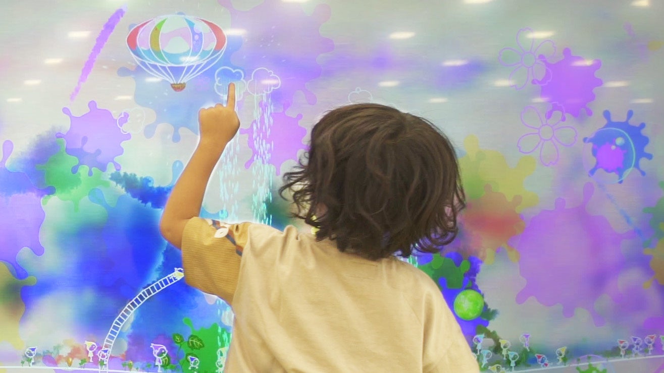 当サービスは、病院やクリニックの待合室、介護施設の交流スペースなどの壁にタッチパネルを設置するだけで創造的な遊びの場が生まれ、待ち時間を楽しみながら過ごすことのできる、医療機関向けの、チームラボのモニター作品です。