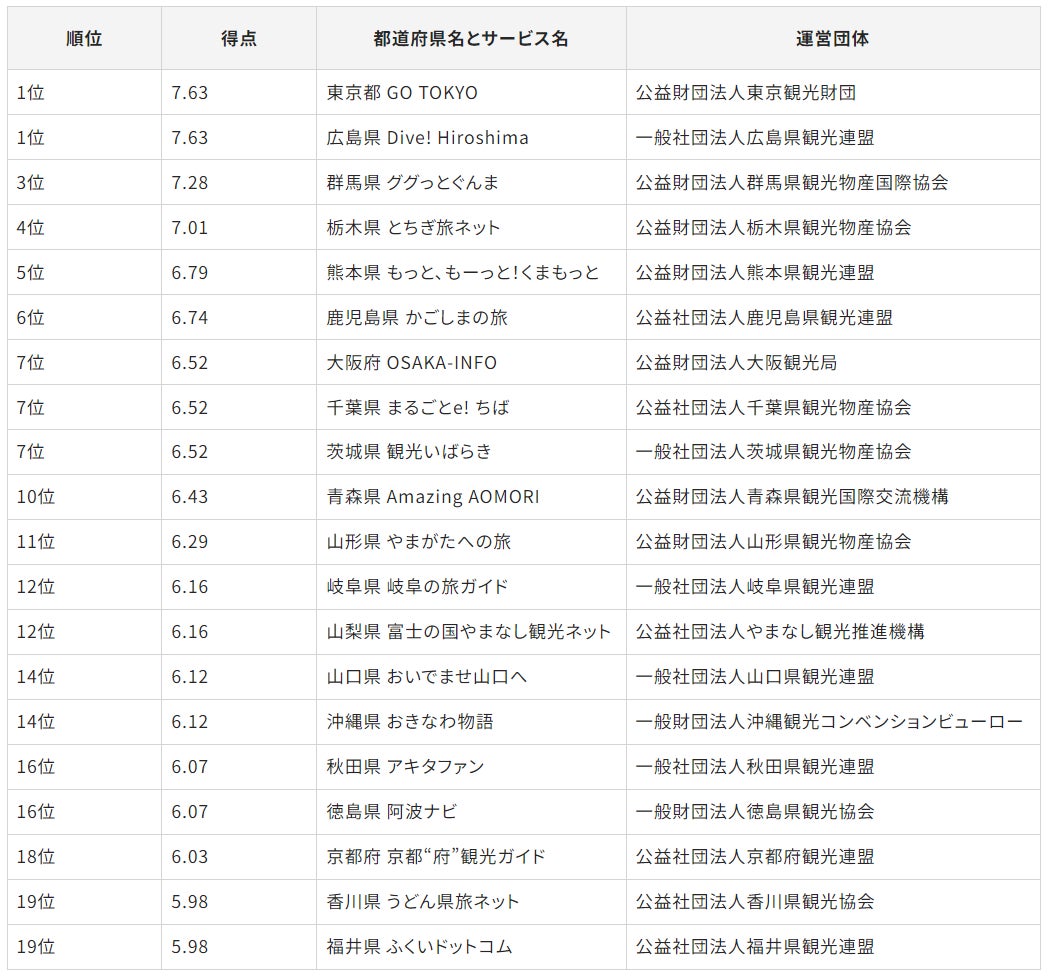 「Gomez 観光情報サイトリライアビリティランキング2023」上位20都道府県は、以下のようになりました。