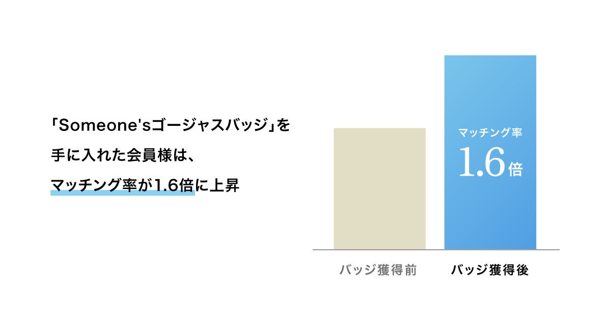 このバッジを獲得した会員様はアプリ内で高い注目を集め、マッチ率は1.6倍へ上昇するなど「理想の出会い」へと繋がる可能性が高まります。どなたがこの栄誉あるバッジを手にするのか、皆様のご応募を心よりお待ちしております。