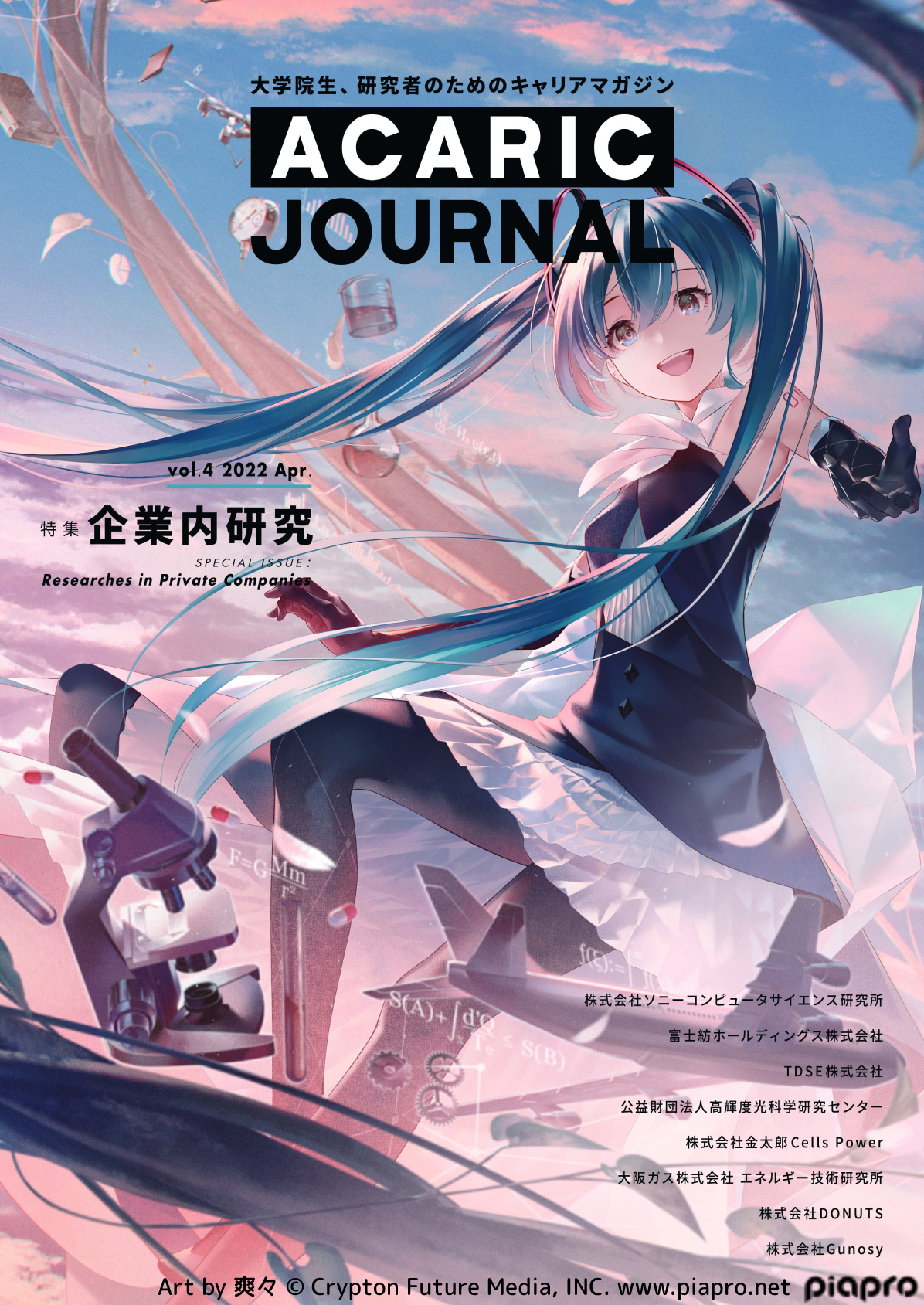 また、前号に引き続き、今号でも弊社臨時CRO (Chief Research Officer)である初音ミクを表紙イラストに起用いたしました(イラスト:爽々氏)。特集テーマである「企業内研究」をイメージし、ややビジネスライクでフォーマルな衣裳に身を包んだ初音ミクが、企業で行われている各分野の先端研究を高みに誘う様子をイラストにしていただきました。