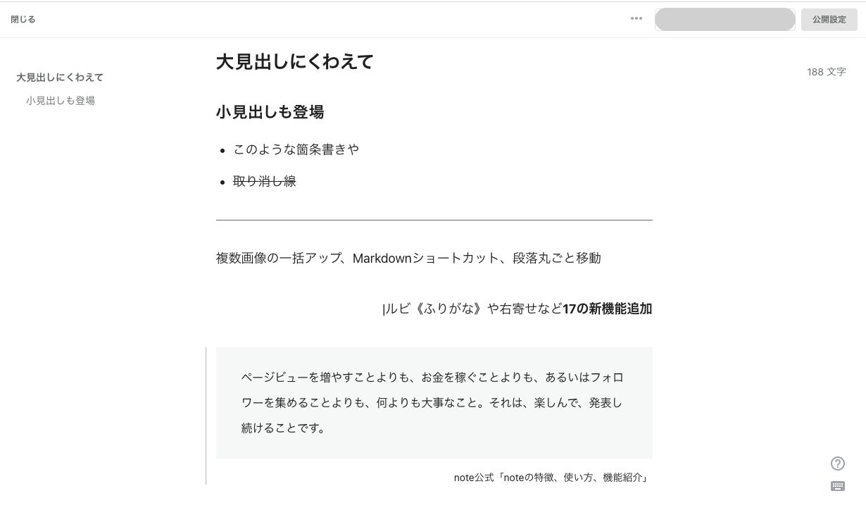 利用者はnoteで作品を発表するだけでなく、下書き保存機能を活用した自分用のメモや、記事の読みやすさを活用したプレゼンテーションツール、作家が執筆するときの草案を書き溜めておく場所など、幅広い用途で記事編集機能を利用してきました。今回、幅広い用途に対応できる新機能を追加したことでドキュメントツールとして進化します。