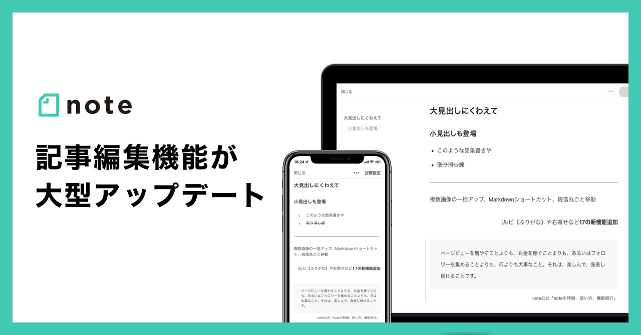 メディアプラットフォームnoteは、4月12日に記事編集機能を大型アップデートしたことをお知らせします。表現力や操作性が向上した、幅広い用途で使えるドキュメントツールです。