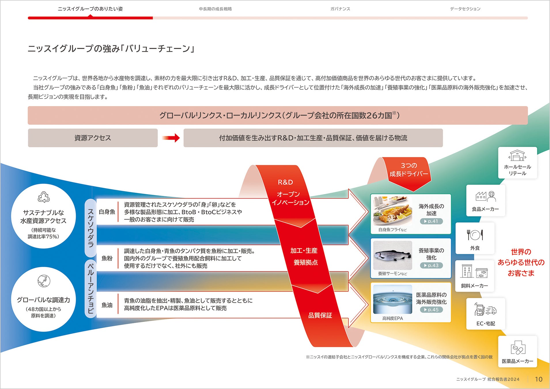 また、長期ビジョン「Good Foods 2030」の実現に向けた経営課題の再整理として2023年度に実施したマテリアリティ(重要課題)の見直しや、それに関連するリスク・機会への対応策を盛り込んだほか、ニッスイグループが有する3つの成長ドライバーの解説を掲載し、成長戦略をより詳細にお伝えしています。