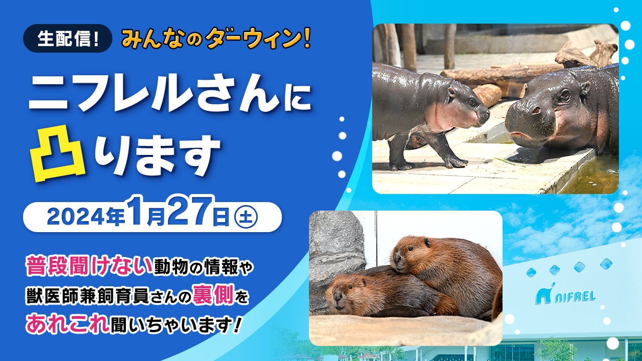 「生配信!みんなのダーウィン!ニフレルさんに凸ります」 1/27開催 普段聞けない動物の情報や獣医師でもある飼育員さんの裏側を聞いちゃいます!