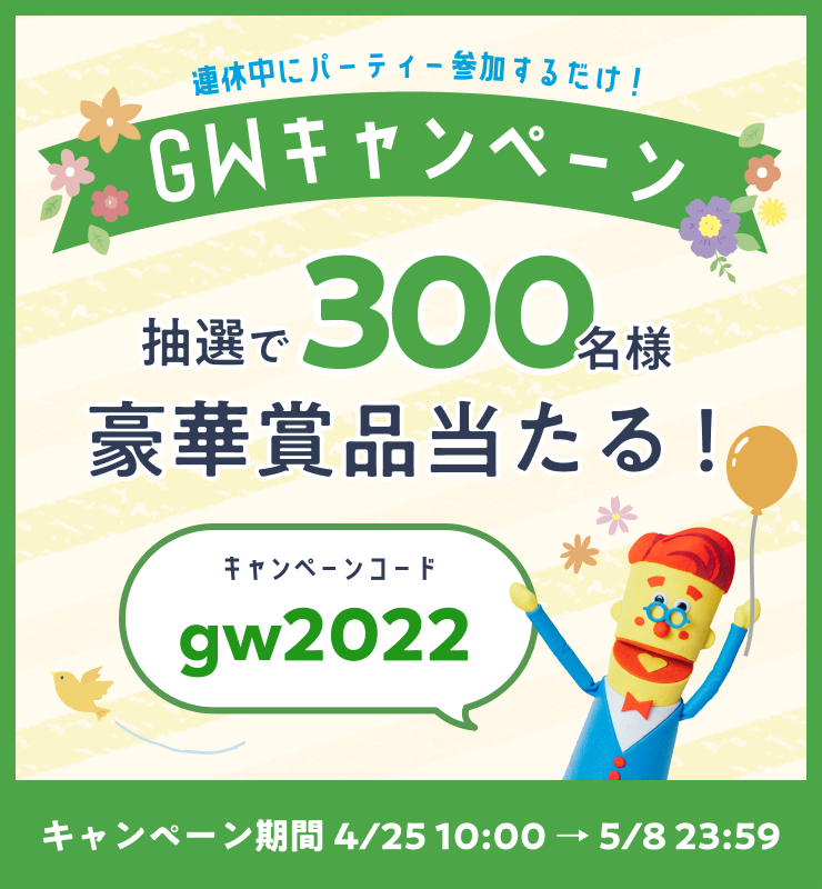 この度、2022年の婚活大応援企画第三弾として『GWキャンペーン♪』を開催いたします。婚活の春に素敵な出会いを婚活パーティーで見つけてほしい、新しい出会い向かってウキウキしながら婚活パーティーに参加してもらいたい、そんな気持ちを込め、良いご縁を引き寄せてもらえるようキャンペーンを企画しました。