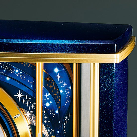 本体:木(MDF・漆 青銀河塗り)・一部金属(アルミ・ヘアライン仕上げ) 前面:曲面ガラス 飾り:金属(ステンレス・金メッキ) 回転飾り:高透過ガラス