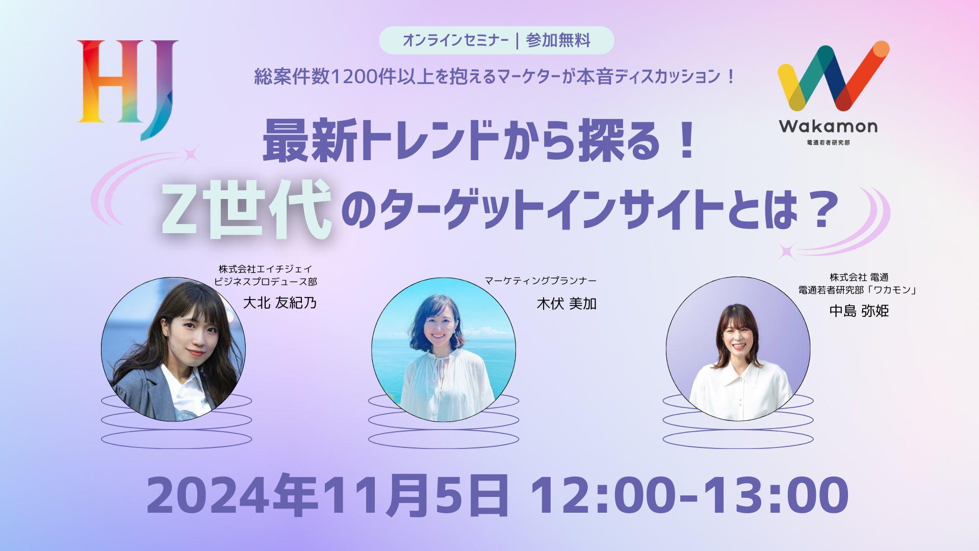 株式会社HJ(本社:東京都渋谷区 代表取締役社長:池田 隼人)は、株式会社電通(本社:東京都港区 代表取締役社長:佐野 傑)の若者研究部「ワカモン」とZ世代をブランドのターゲットとしているマーケティング担当者向けのウェビナーを「総案件数1200件以上を抱えるマーケターが本音ディスカッション!最新トレンドから探る!Z世代のターゲットインサイトとは?」と題し開催することをお知らせします。