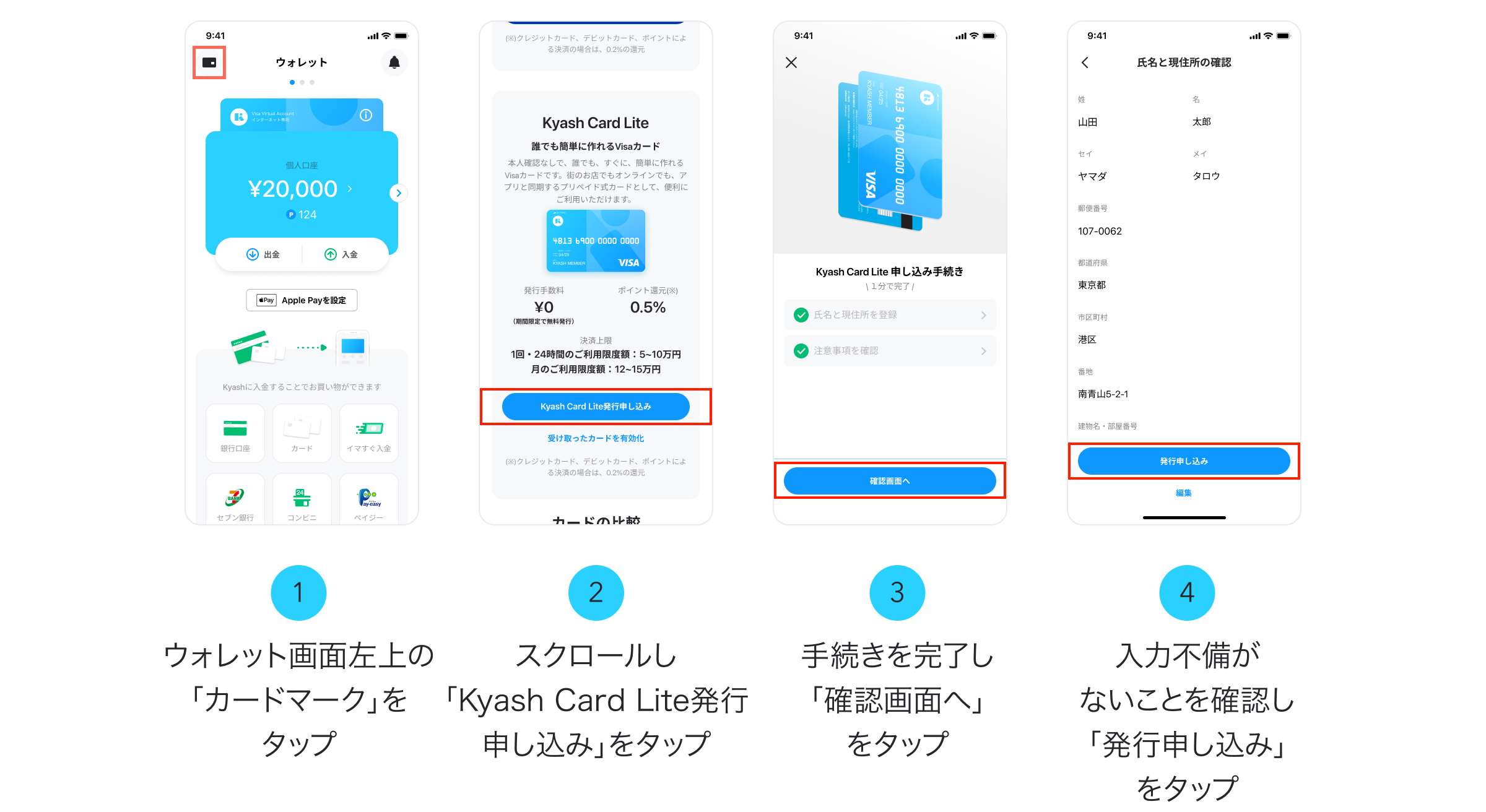 Kyashアプリから氏名・お届け先の登録、注意事項の確認をするだけで発行手続きが完了