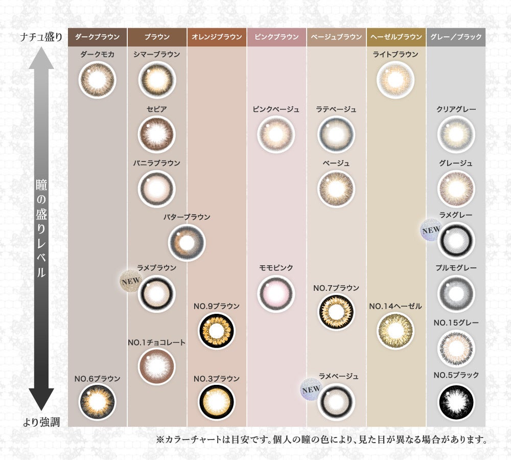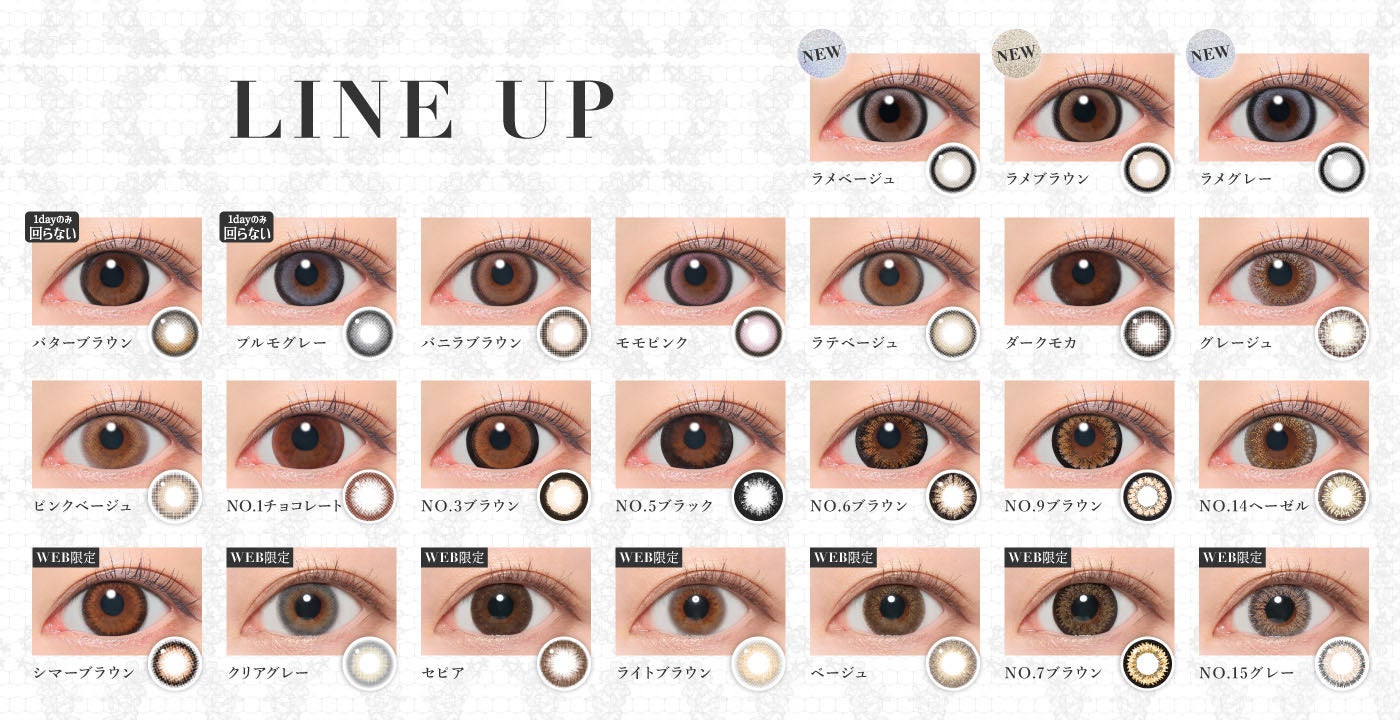 ※ラメベージュ、ラメグレーは1dayのみの取り扱いとなります。※NO.7ブラウン・NO.15グレーは度なしのみとなります。
