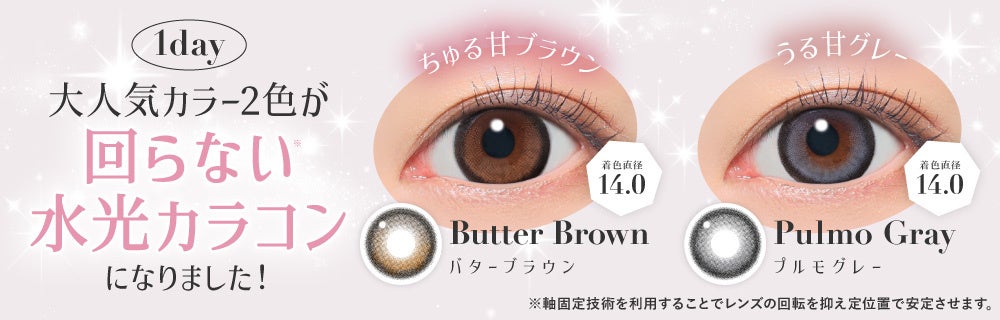 1番可愛い位置をキープ!水光デザインが人気の「Butter Brown(バターブラウン)」「Pulmo Gray(プルモグレー)」の1day2カラーが軸固定の回らない水光カラコンへとアップデートしました!