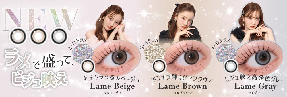 ラメ入りカラコンが新登場!「Lame Beige(ラメベージュ)」「Lame Gray(ラメグレー)」はオーロララメ、「Lame Brown(ラメブラウン)」はゴールドラメと、カラーによってラメの種類を使い分けたこだわりのデザインでキラキラ発色が盛れも映えも叶えます♡