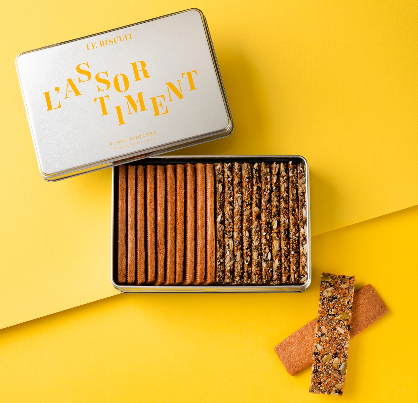 アラン・デュカスの思い出に残る「おばあちゃんが作ってくれたバターの風味たっぷりのビスケット」を再現した「ピュール・ブール」と、カボチャの種やヘンプシード、アマニの実など8種類の穀物と種を使った「バー・セレアル」をセットにしました。サクサクとした口当たりとバターの味わいや、ザクザクとした歯ごたえ、プチプチとはじけるようなセレアル独特の食感と味をお楽しみいただけます。