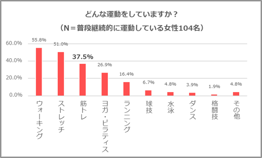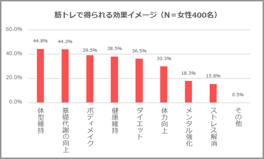 「女性の運動ニーズ調査2022(調査主体:LIFE CREATE)」において、普段継続して運動している人が取り組んでいる種目として、筋トレは、ウォーキングやストレッチに次いで全体37.5%と第3位の結果となりました。男性イメージが強い筋トレですが、女性にとっても日常的に取り入れやすい運動として定着していることがうかがえます。また筋トレで得られる効果イメージとして、「体形維持(44.8%)」「基礎代謝の向上(44.3%)」「ボディメイク(39.5%)」がトップ回答となり、女性たちにとって、筋トレが自分のなりたい理想の体型づくりのために取り組むもの、といったイメージがあることもわかりました。