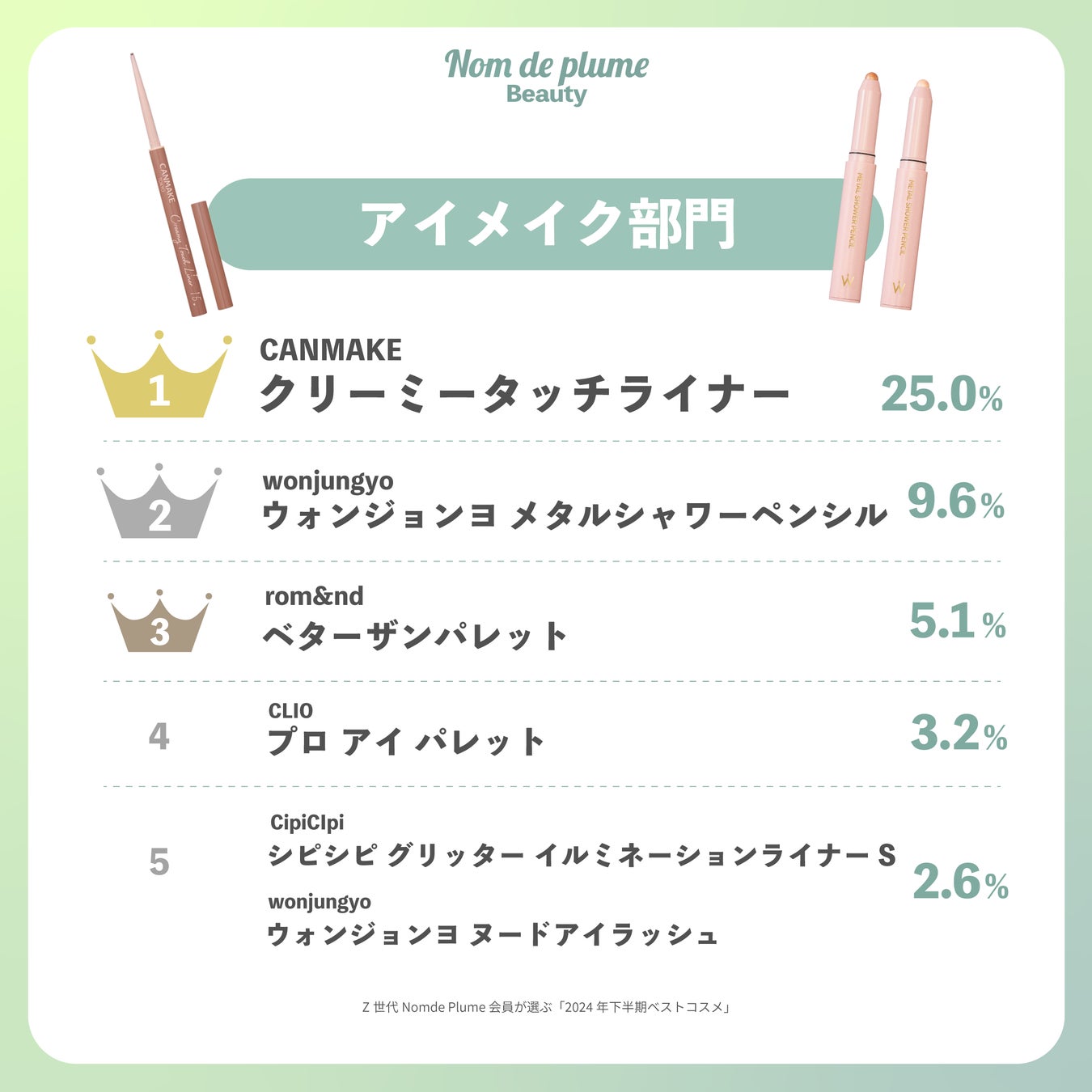 アイメイク・リップ・チーク/ハイライト部門では、fweeやAmuse、wonjungyoなどの韓国系ブランドが好まれる結果に。カラーバリエーションが豊富で、全体的に淡い色合いのアイテムがZ世代に親しまれています。