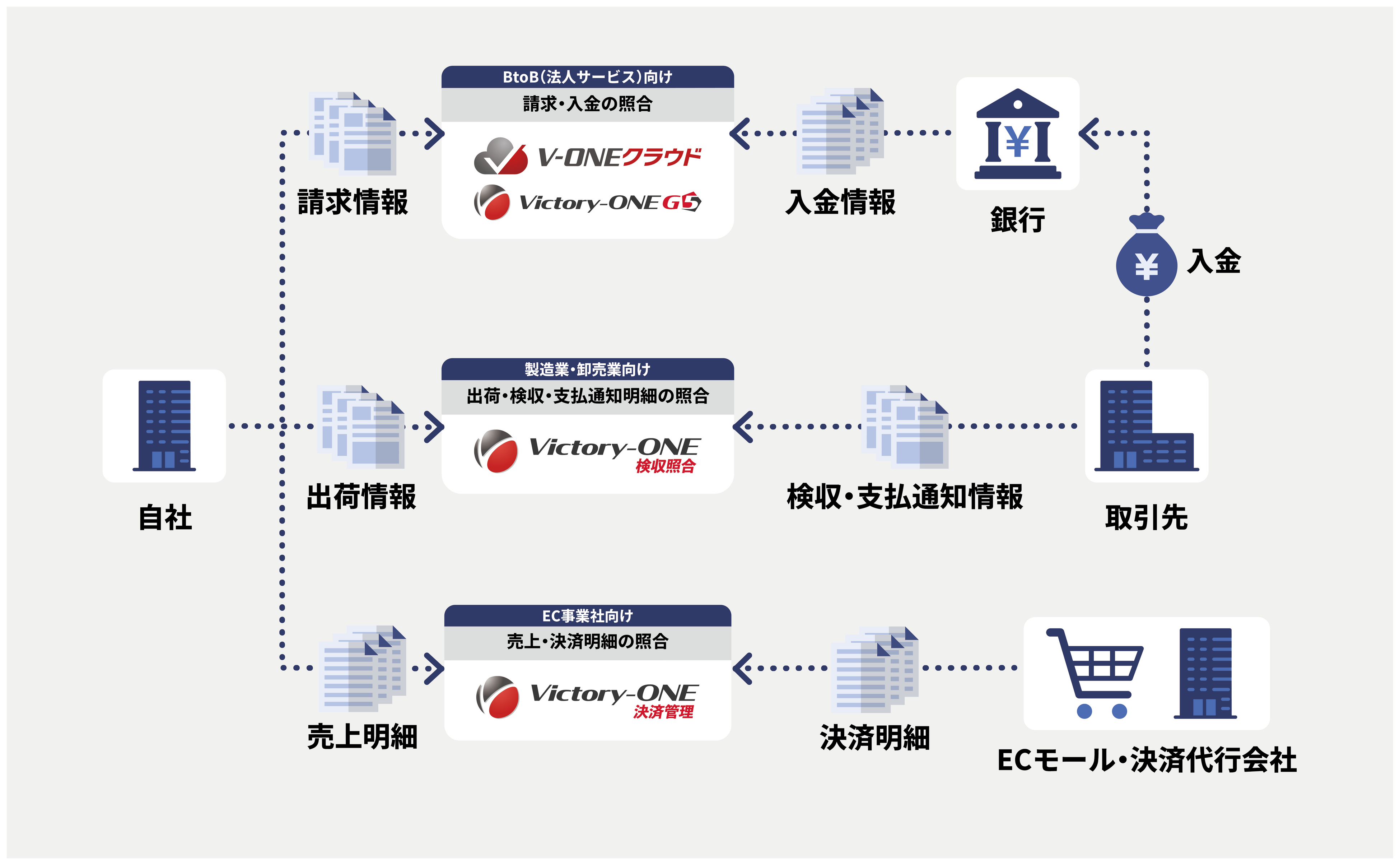 入金消込特化型システム「V-ONEクラウド」を筆頭に基幹システムとの連携や自社サーバーへの組み込みなどのカスタマイズが可能な債権管理・入金消込システム「Victory-ONE/G5」、またEC特有の商流である決済明細と売上明細を照合する「Victory-ONE【決済管理】」、メーカーや卸売業特有の支払通知書と売上明細を照合する「Victory-ONE【検収照合】」の4製品から構成される照合・消込に特化した製品シリーズです。