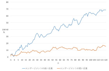 一橋大学大学院 野間幹晴教授と連携し、「Wevox」を用いて測定したエンゲージメントと株価について研究。2020年4月7日に緊急事態宣言が発出された日をイベント日とするイベント・スタディを実施したところ、エンゲージメントの高い企業では株価が約65%上昇したものの、エンゲージメントが低い企業では株価上昇の効果は小さかった。