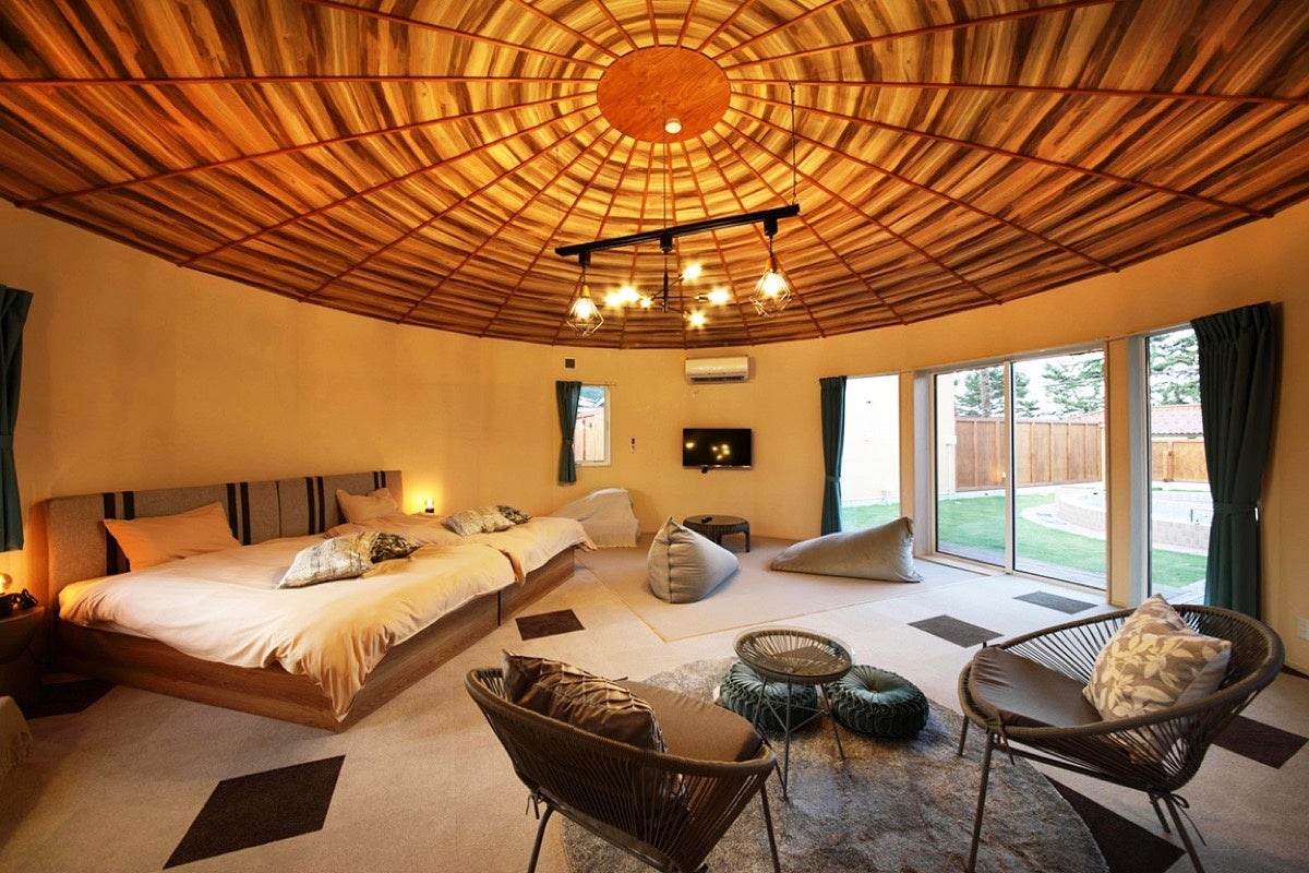 スタンダード2ベッドが2棟、スタンダード4ベッドが1棟、そして今回新たに完成した最大8名のデラックスヴィラの全4棟がございます。独特な円形状のヴィラタイプのお部屋で、非日常感を味わっていただけるインテリアにこだわりました。