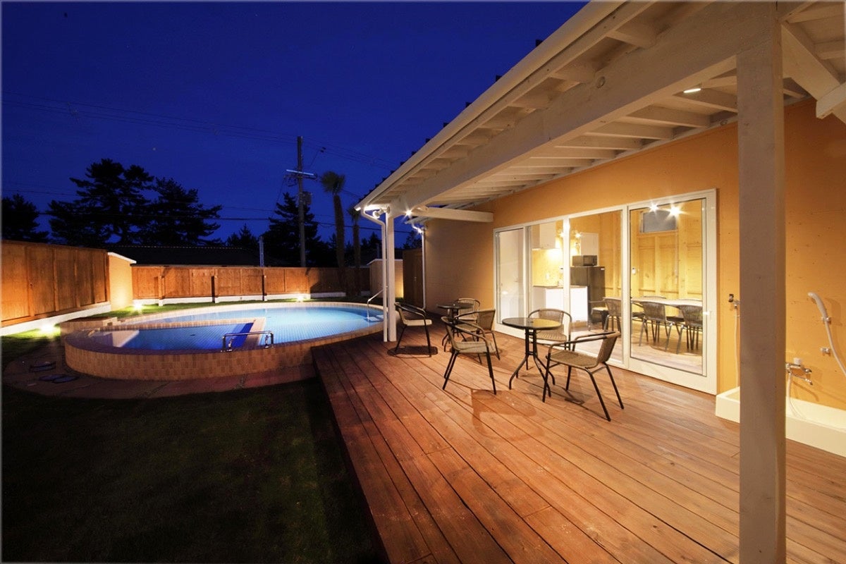 各棟のガーデンスペースには、直径6mのプライベートプールを完備しております。わんちゃん専用エリアの水深は30㎝と比較的浅いわんちゃん専用エリアを設けており、小型犬でも楽しみやすい仕様となっております。