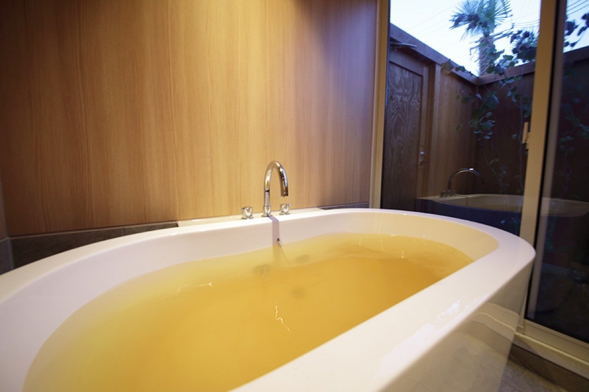 各棟には、自家源泉「金温泉」の天然温泉を完備しています。人はもちろん、わんちゃんにもご入浴いただけるよう簡易バスタブを用意しております。金温泉は、鉄分を多く含む刺激の少ないまろやかな肌あたりです。塩分濃度が高いため、舐めるとしょっぱく感じますが、塩分濃厚で殺菌力の高い湯が優れた保温・保湿効果と血行促進と多数の効能を得られます。