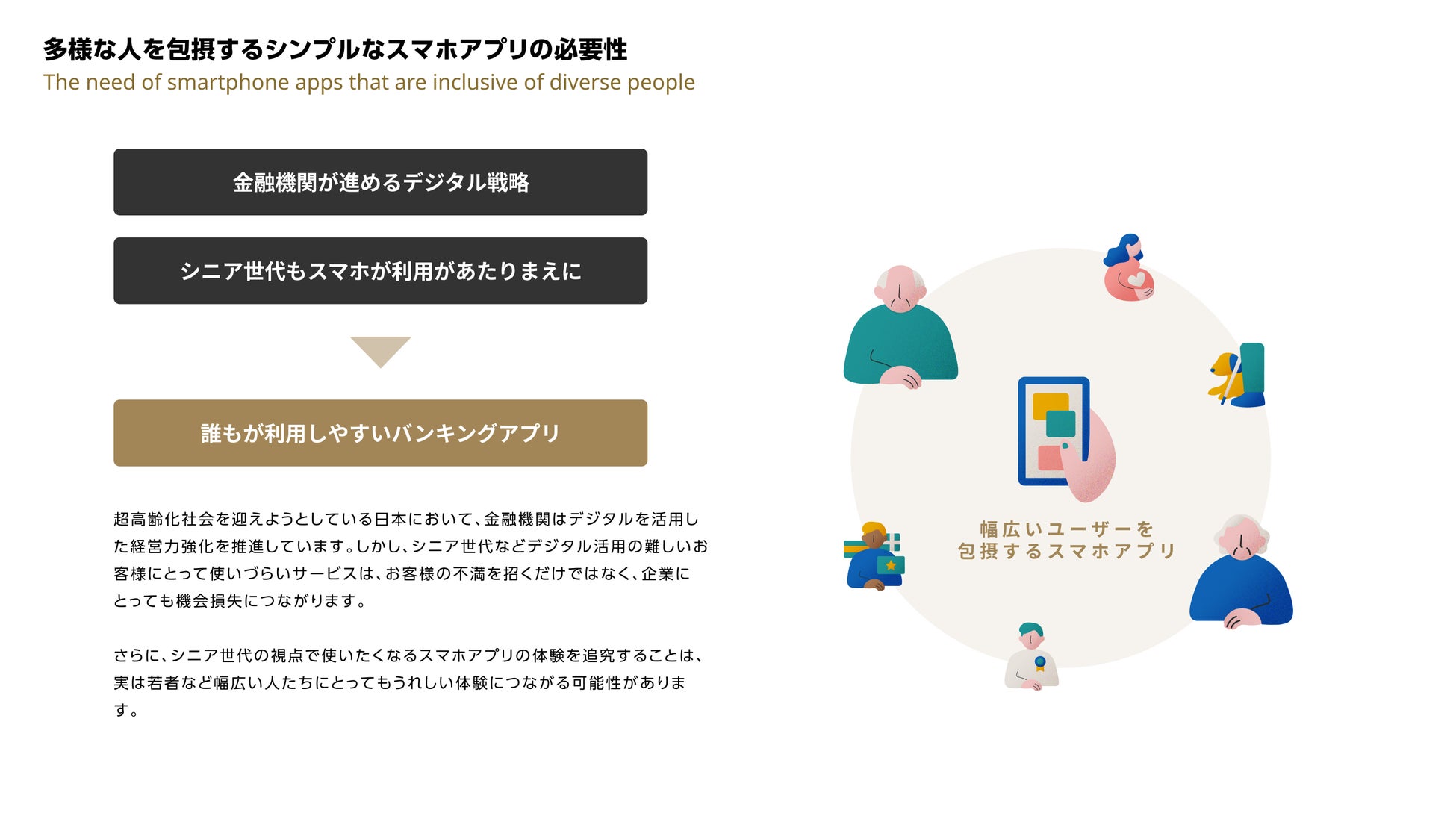 超高齢化社会を迎えようとしている日本において、金融機関はデジタルを活用した経営力強化を推進しています。しかし、シニア世代などデジタル活用の難しいお客様にとって使いづらいサービスは、お客様の不満を招くだけではなく、企業にとっても機会損失につながります。 さらに、シニア世代の視点で使いたくなるスマホアプリの体験を追究することは、実は若者など幅広い人たちにとってもうれしい体験につながる可能性があります。