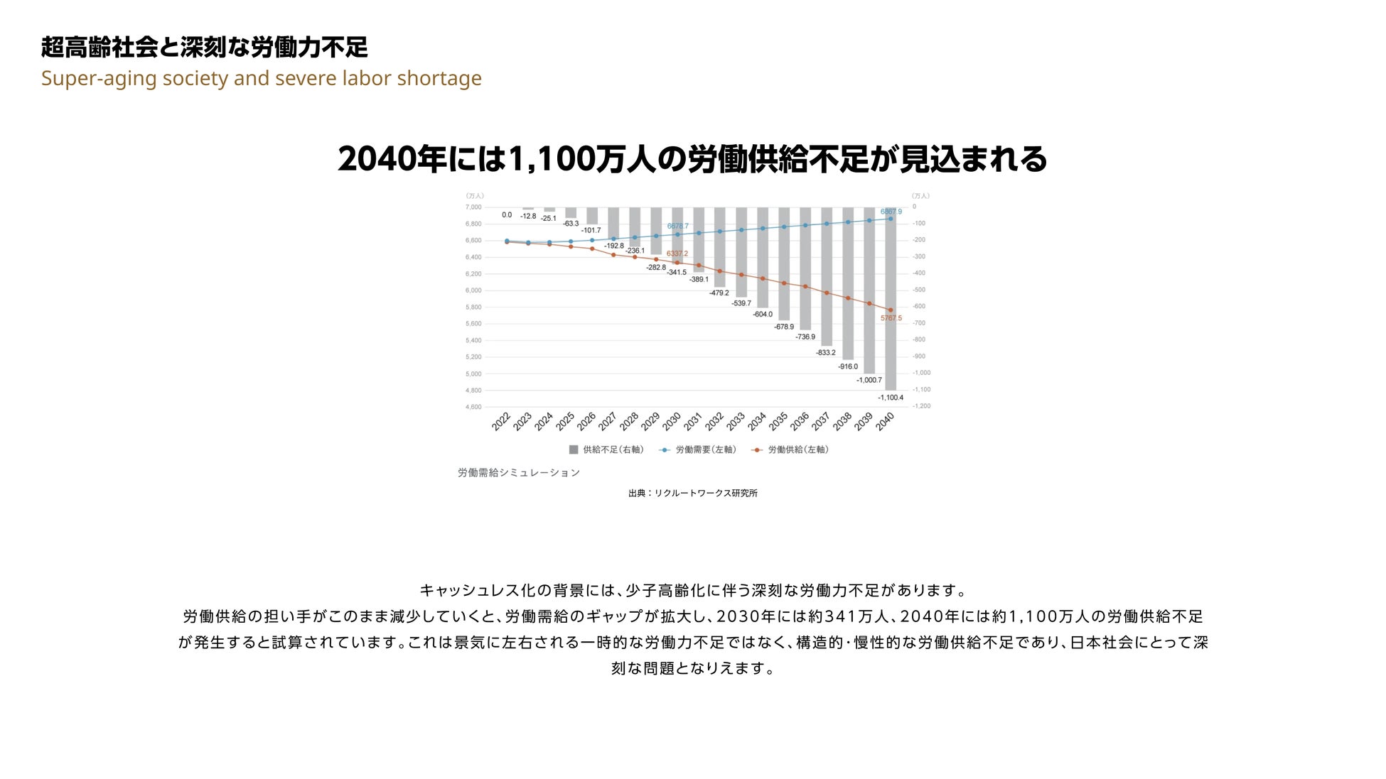 キャッシュレス化の背景には、少子高齢化に伴う深刻な労働力不足があります。 労働供給の担い手がこのまま減少していくと、労働需給のギャップが拡大し、2030年には約341万人、2040年には約1,100万人の労働供給不足が発生すると試算されています。これは景気に左右される一時的な労働力不足ではなく、構造的・慢性的な労働供給不足であり、日本社会にとって深刻な問題となりえます。