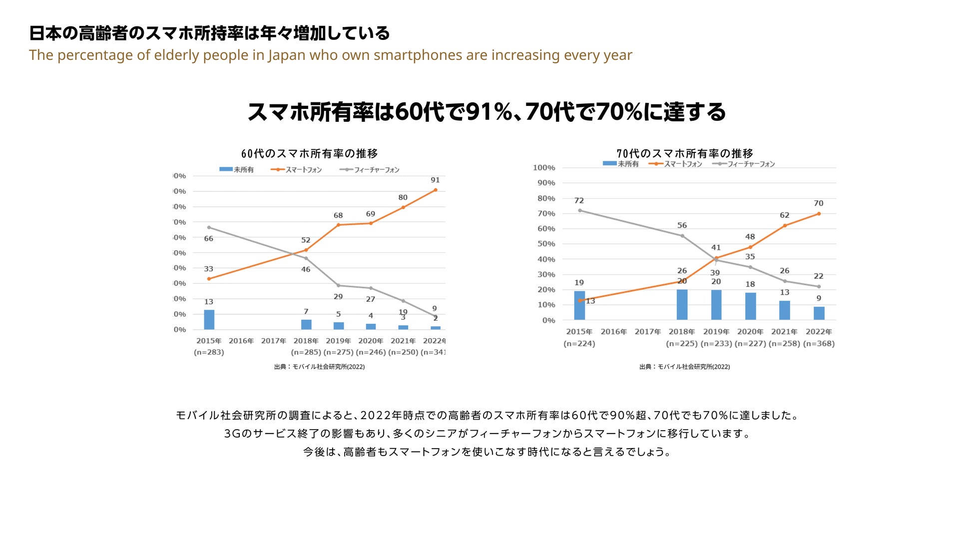 モバイル社会研究所の調査によると、2022年時点での高齢者のスマホ所有率は60代で90%超、70代でも70%に達しました。 3Gのサービス終了の影響もあり、多くのシニアがフィーチャーフォンからスマートフォンに移行しています。 今後は、高齢者もスマートフォンを使いこなす時代になると言えるでしょう。