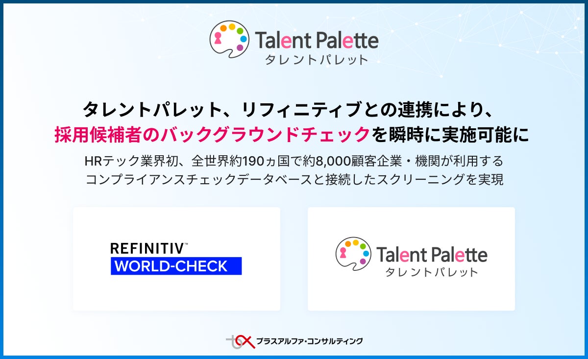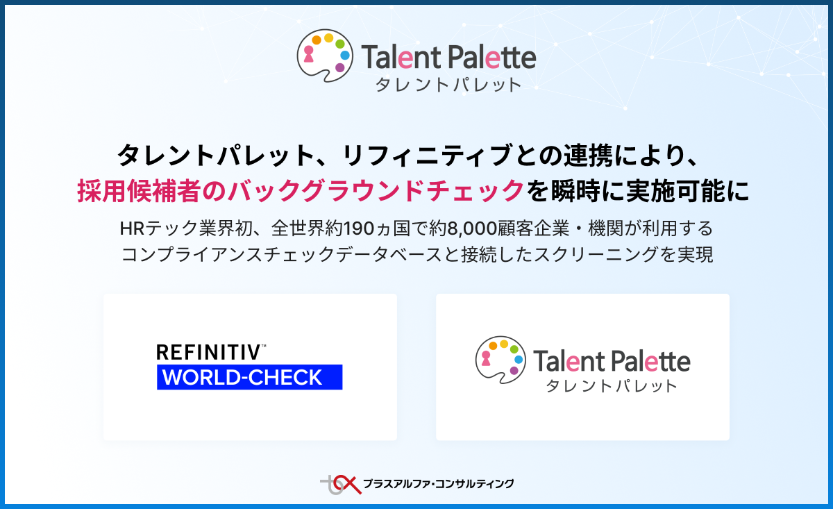 株式会社プラスアルファ・コンサルティング(本社:東京都港区、代表取締役社長:三室克哉、証券コード:4071)はデータに基づいた人事戦略の実現を目指すタレントマネジメントシステム「Talent Palette(タレントパレット)」において、世界有数の金融市場インフラおよびデータプロバイダーであるLSEG(ロンドン証券取引所グループ)傘下のリフィニティブ(以下「リフィニティブ」)が提供するコンプライアンスチェックデータベースサービス「World-Check」と連携した、採用候補者のバックグラウンドチェックサービスを開始します。