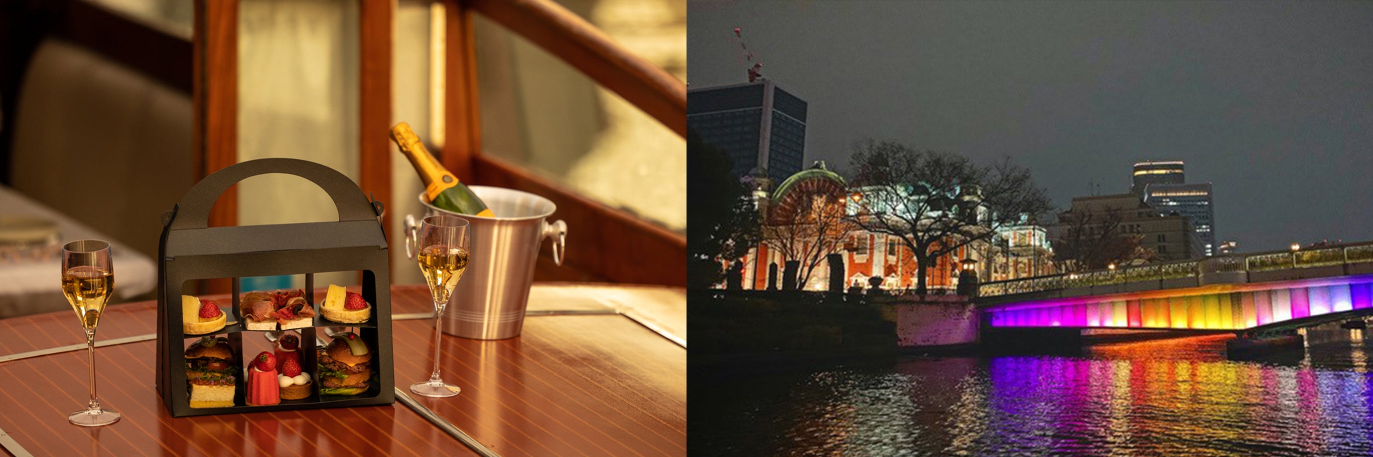 桜舞い散る堂島川をクルージングしながら、大阪を象徴する建造物、大阪市役所や大阪中之島公会堂を眺め、クライマックスには桜並木越しに仰ぎ見る大阪城、桜の名所大川の桜に目を奪われる、各回一組限定のエクスクルーシブで優雅なプライベートクルーズプランをデイタイムとイブニングタイムで2つのプランをご用意しました。デイタイムにはスイーツメインの「コンラッドアフタヌーンティー テイクアウトボックス」、イブニングタイムにはセイボリーメインの「アペリティフ・アンダー・ザ・スカイ SAKURA テイクアウトボックス」で、趣きある大人の夜桜鑑賞をお楽しみいただけます。