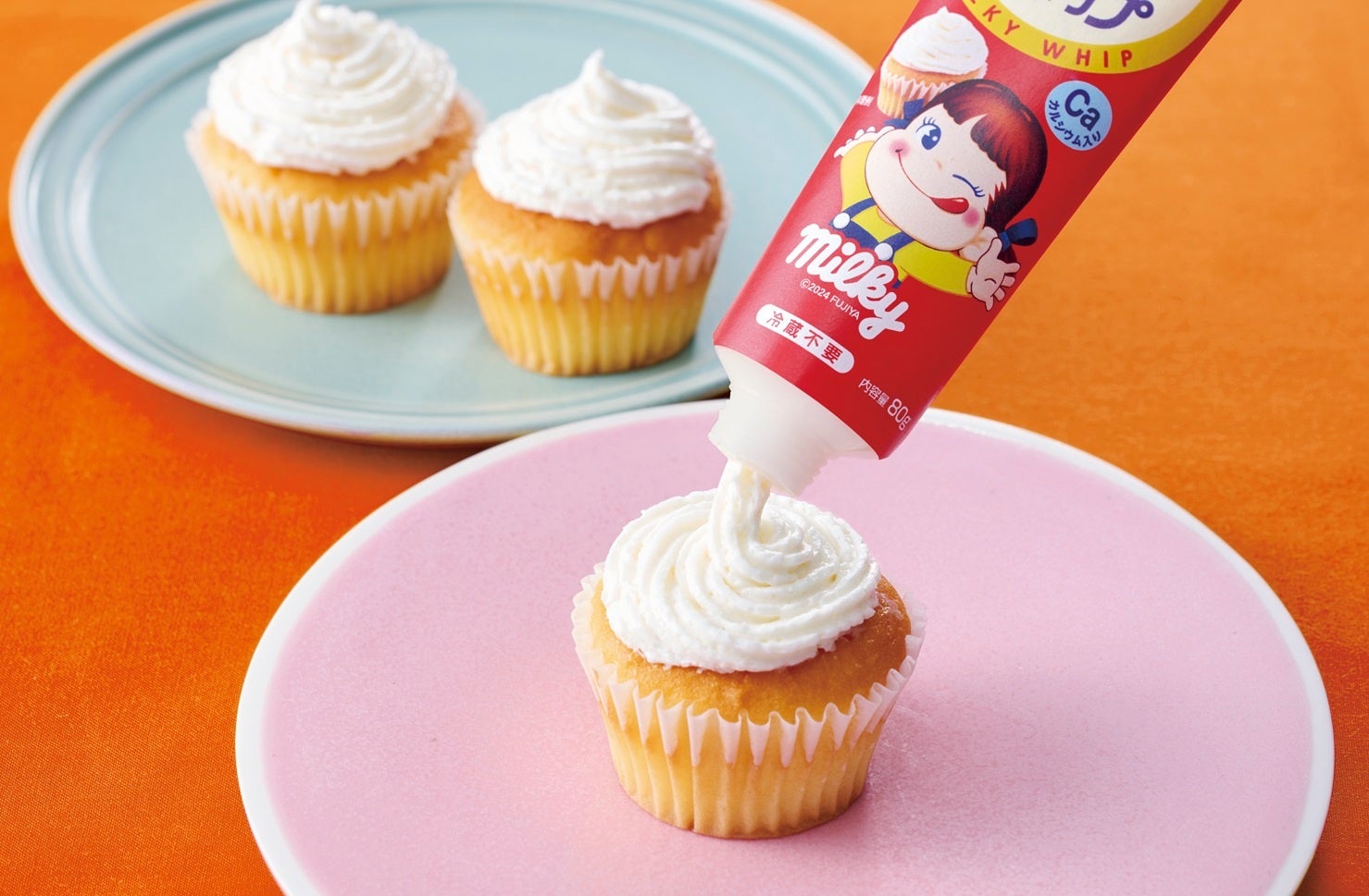 「ミルキーホイップ」は、「ミルキー」に使われているこだわりの練乳原料を使用し、「ミルキー」の味わいそのままに、ふんわり軽く、まるで生クリームのような口どけ滑らかなホイップです。やわらかいパンと相性がよく、食パンにはさんだホイップサンドがおすすめです。他にもクラッカーやケーキのトッピングなど幅広く楽しめます。
