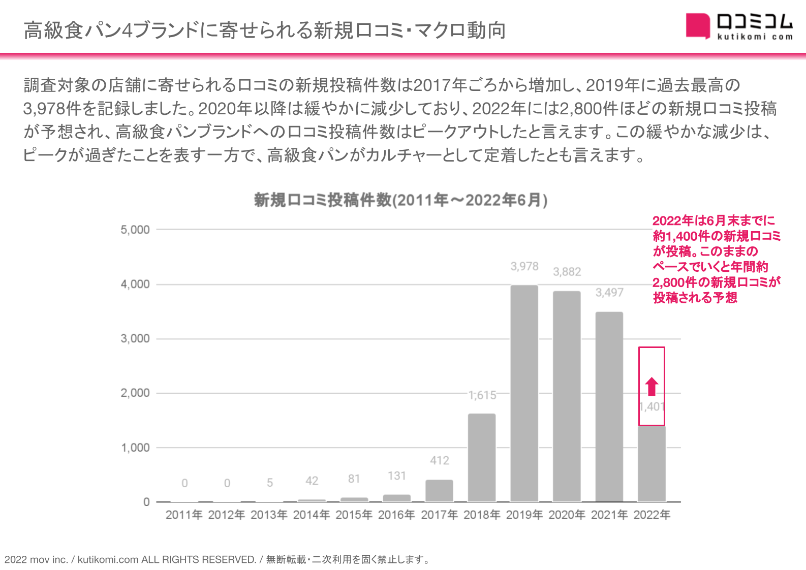 調査対象の高級食パン専門店4ブランドにおいては、新規口コミは2016年以降増加し2019年に過去最高の3,978件を記録しました。2020年から緩やかに減少し、2022年は2,800件程の口コミが予想されます。2019年でピークアウトはしたものの、この緩やかな減少は高級食パン専門店がカルチャーとして定着したとも言えそうです。