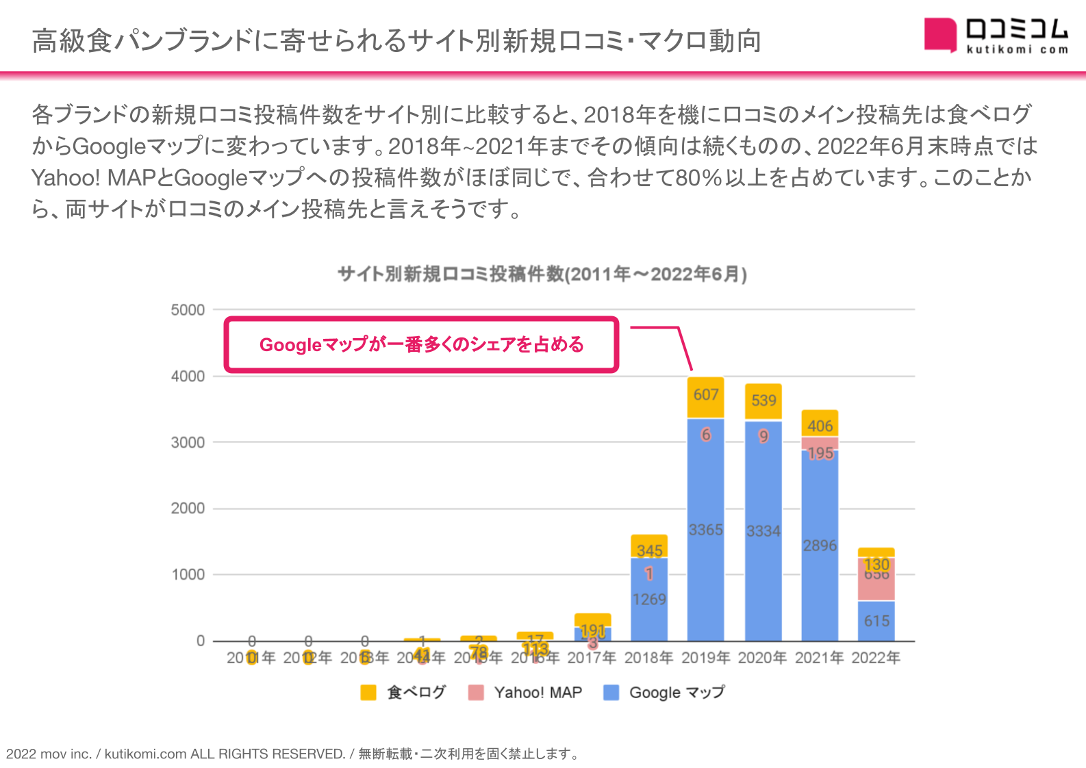 高級食パン4ブランドに寄せられた口コミをサイト別に比較すると、2018年を機に口コミのメイン投稿先は食べログからGoogleマップに変わっています。2018年~2021年までその傾向は続くものの、2022年6月末時点ではYahoo! MAPとGoogleマップへの投稿件数が同程度で合わせて80%以上を占めています。このことから、両サイトが口コミのメイン投稿先と言えそうです。