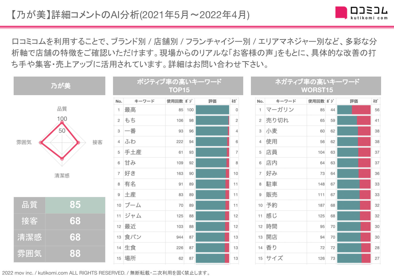 詳細なレポートでは各ブランド間の比較、乃が美以外のブランドについてのQSCAとポジネガキーワードをご確認いただけます。是非、ダウンロードして詳細をご確認下さい。