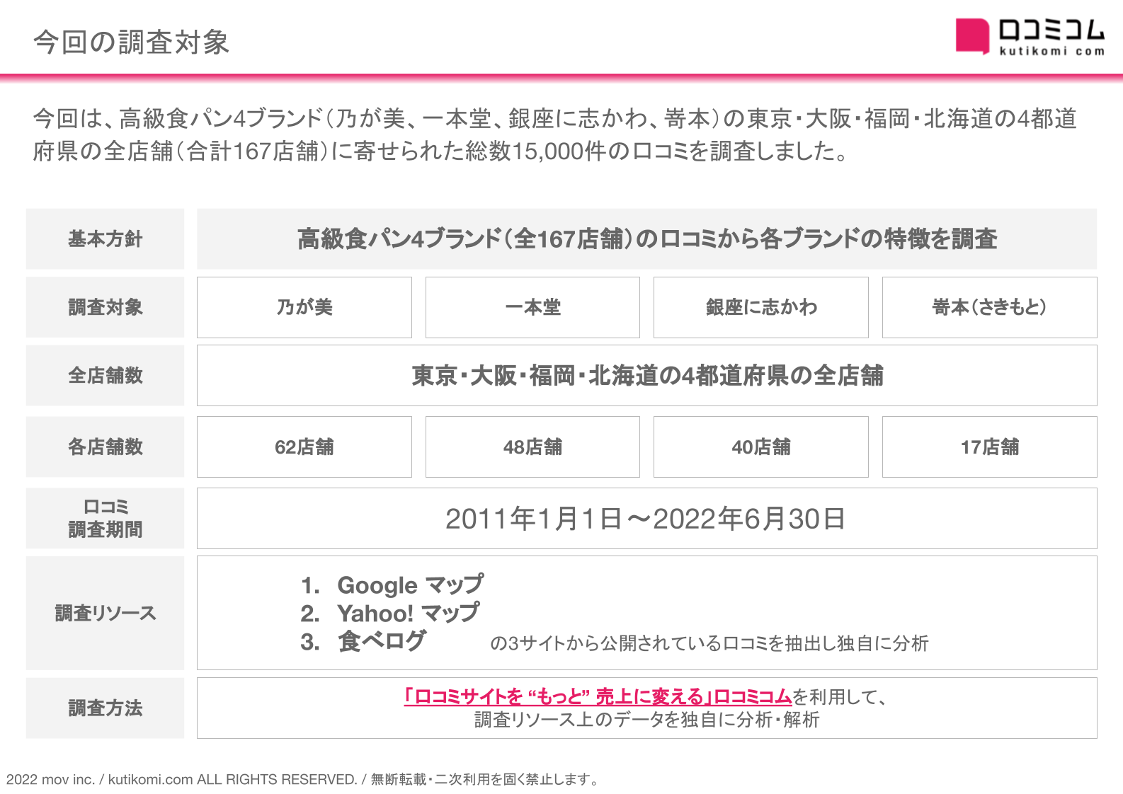 今回は、東京、大阪、福岡、北海道にある高級食パン専門店4ブランド(乃が美、一本堂、銀座に志かわ、嵜本)合計167店舗に寄せられた15,000件の口コミを分析しました。