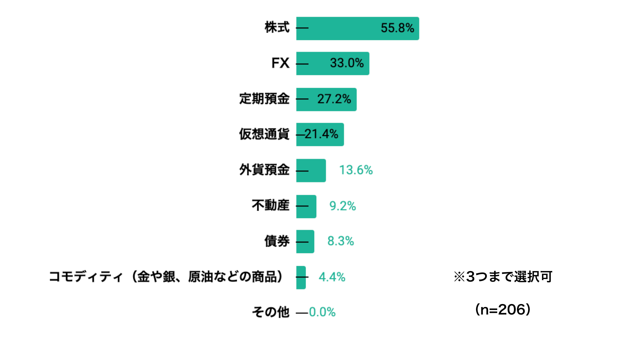 2. 投資してみたい金融商品は「株式」「FX」「定期預金」「仮想通貨」が上位