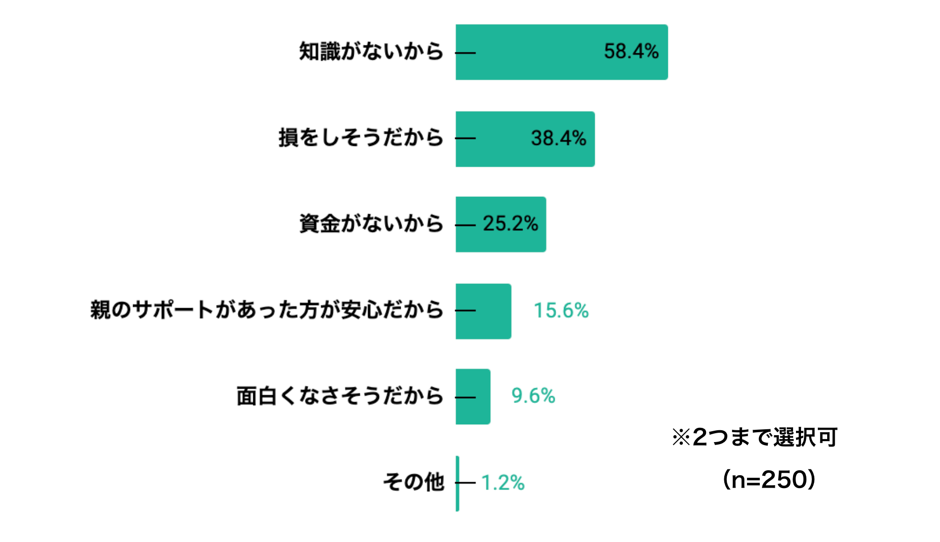 【Q 2022年4月から成人年齢引き下げに伴い、保護者の同意なく投資を始めてみたいと思いますか?】で「いいえ」と答えた方のうち 58.4% が「知識がないから」を挙げており、最多の理由であることが分かりました。