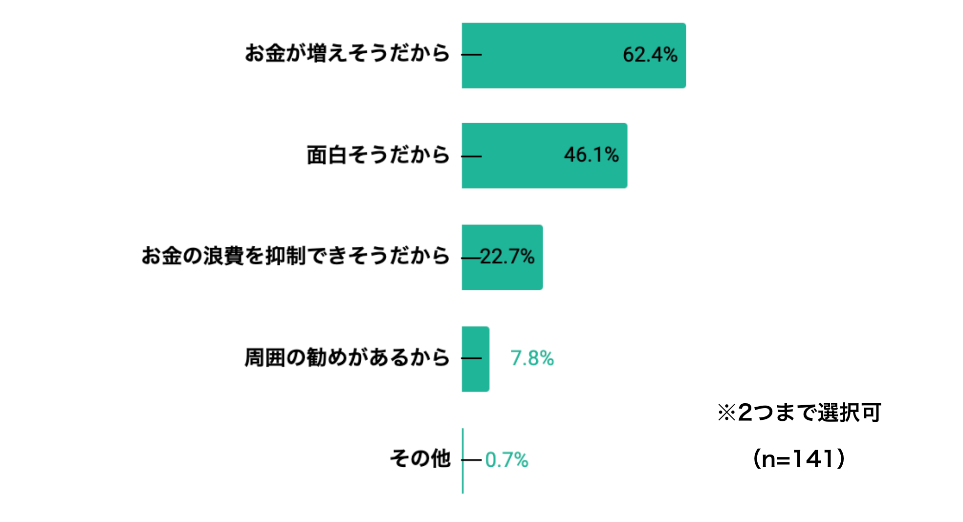 【Q 仮想通貨に投資してみたいと思いますか?】で「はい」と答えた方のうち 62.4% が「お金が増えそうだから」と回答したことが分かりました。