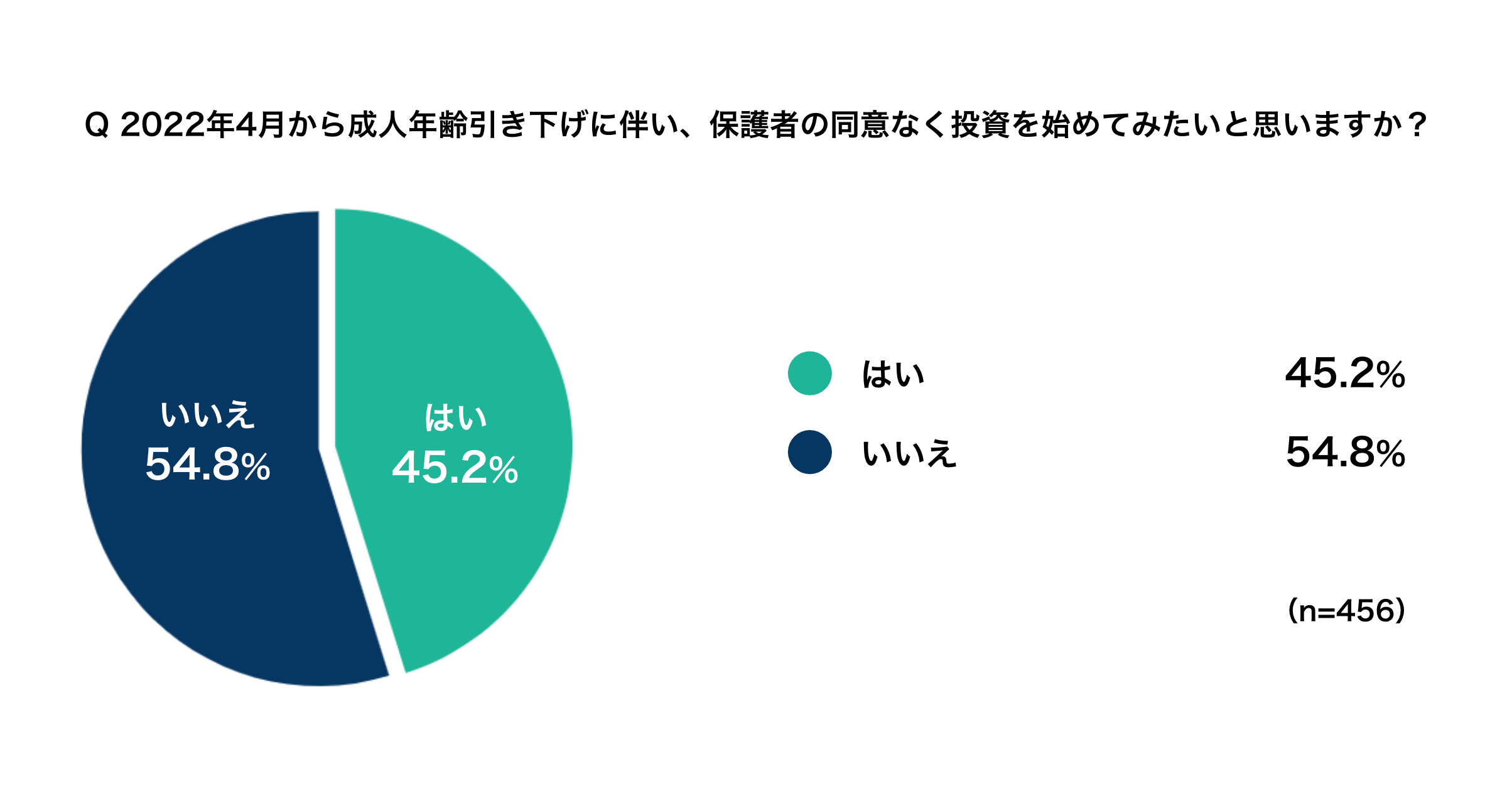 【Q 2022年4月から成人年齢引き下げに伴い、保護者の同意なく投資を始めてみたいと思いますか?】では、「はい」が 45.2%、「いいえ」が 54.8% という結果になりました。