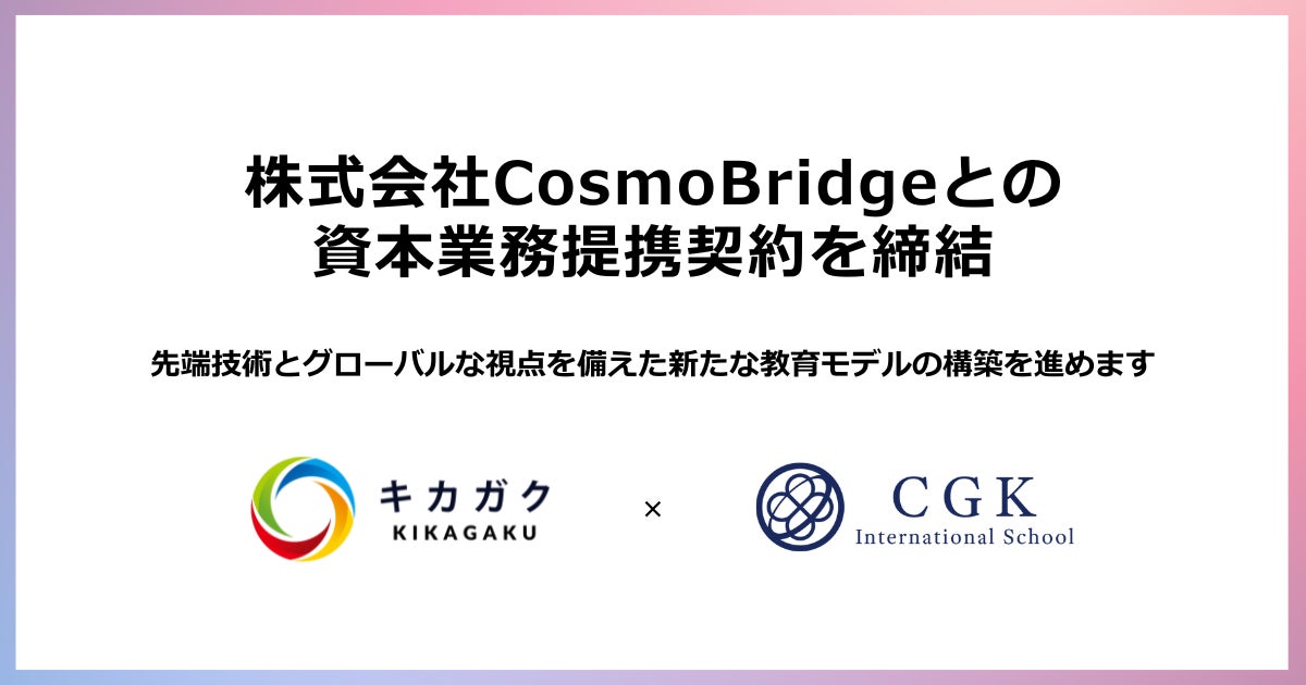 株式会社キカガク(本社:東京都、代表取締役:⼤崎将寛、以下当社)は、株式会社CosmoBridge(本社:神奈川県、代表取締役:甲斐実、以下 CosmoBridge 社) と、資本業務提携契約を締結しましたので、お知らせいたします。