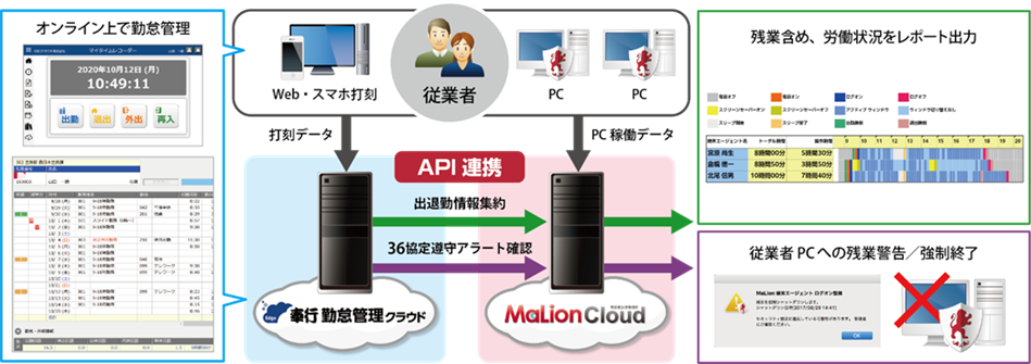 勘定奉行・奉行クラウドをはじめとする基幹業務システムを開発・販売する株式会社オービックビジネスコンサルタント(代表取締役社長:和田 成史/本社:東京都新宿区/以下OBC)は、OBCの『奉行Edge 勤怠管理クラウド』と株式会社インターコム(代表取締役社長 COO:須藤 美奈子/本社:東京都千代田区)のIT資産管理クラウドサービス『MaLionCloud』がAPI連携を開始したことをお知らせします。これにより、テレワークなど離れた場所で働く従業員においてもクラウド上で労働状況を可視化し、労働時間の適正把握と長時間労働の防止ができます。