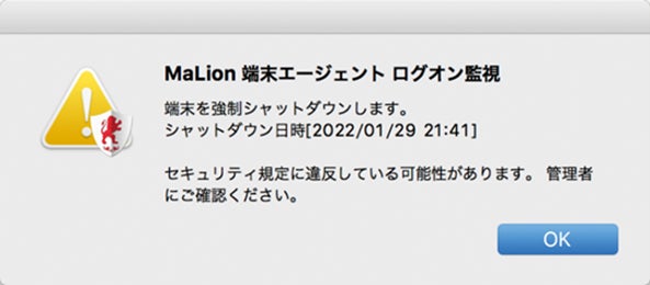 『奉行Edge 勤怠管理クラウド』で36協定の警告アラート対象者を把握し、『MaLionCloud』上で対象者のPCに対する警告表示設定を行うことで、業務終了時刻が迫ったタイミングでPC上に警告表示します。強制シャットダウンを実行することもできるため、確実な長時間労働の是正が行えるようになります。
