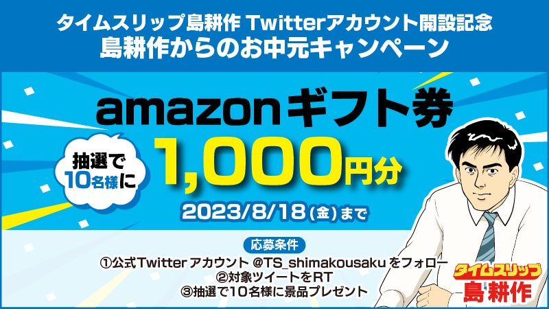 タイムスリップ島耕作の公開を記念として、抽選で10名様にAmazonギフトカードが当たるキャンペーンも実施中ですので、是非皆様ご参加ください。