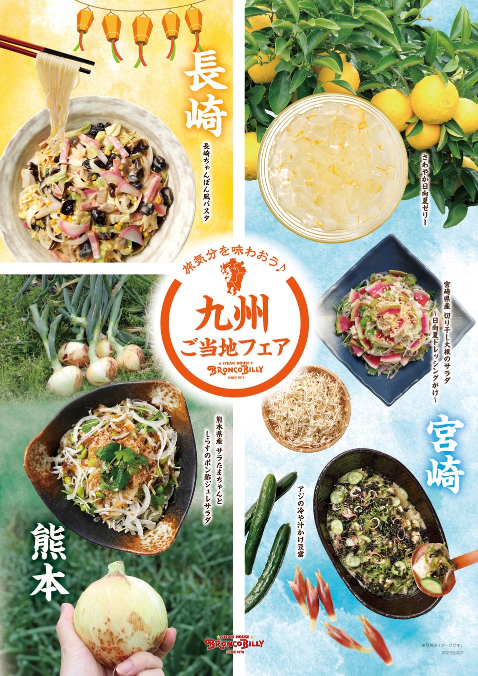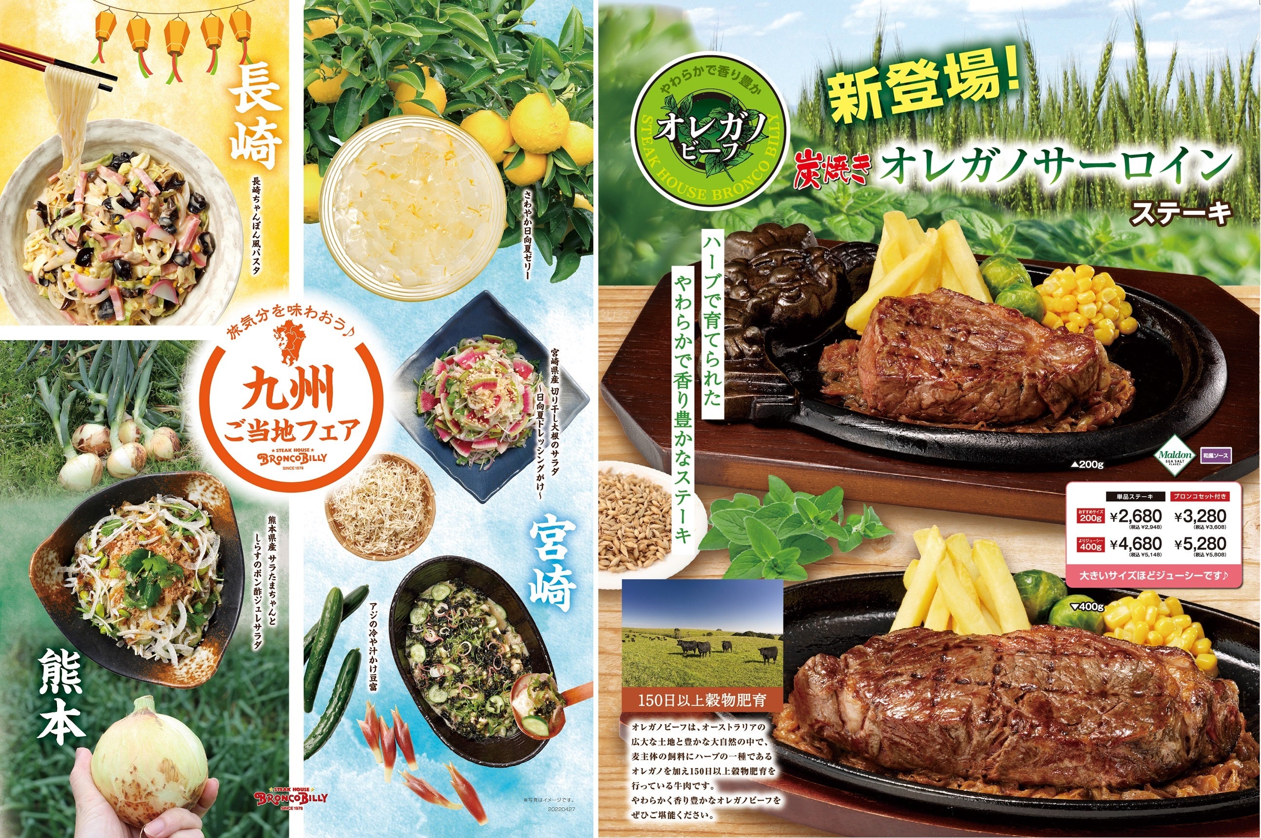 株式会社ブロンコビリー(本社:愛知県名古屋市 代表取締役社長:竹市 克弘)は、ご当地の美味しい食材や郷土料理をアレンジして、サラダバーでお届けする「ご当地フェア」の第5弾『九州ご当地フェア』を、4月27日(水)より期間限定で、全129店舗にて提供を開始します。九州7県の内、宮崎・長崎・熊本県の特産品をお召し上がりいただけます。また、4月28日(木)からは、GW特別メニューとしてオーストラリア産『炭焼きオレガノサーロインステーキ』も全店でスタートいたします。ハーブの一種であるオレガノで育てられた「オレガノビーフ」を、『九州ご当地フェア』と一緒にお楽しみください。URL: http://www.bronco.co.jp/