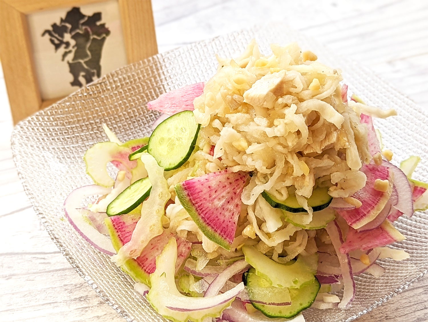 国内有数の産地、宮崎県産切り干し大根と、フレッシュな紅芯大根やレッドオニオン、きゅうりやセロリを使用した、1皿に数種類もの野菜がつまった、栄養価の高いサラダです。ナンプラーが効いたエスニック風の日向夏ドレッシングは、フルーティーでクセになる味わいです。