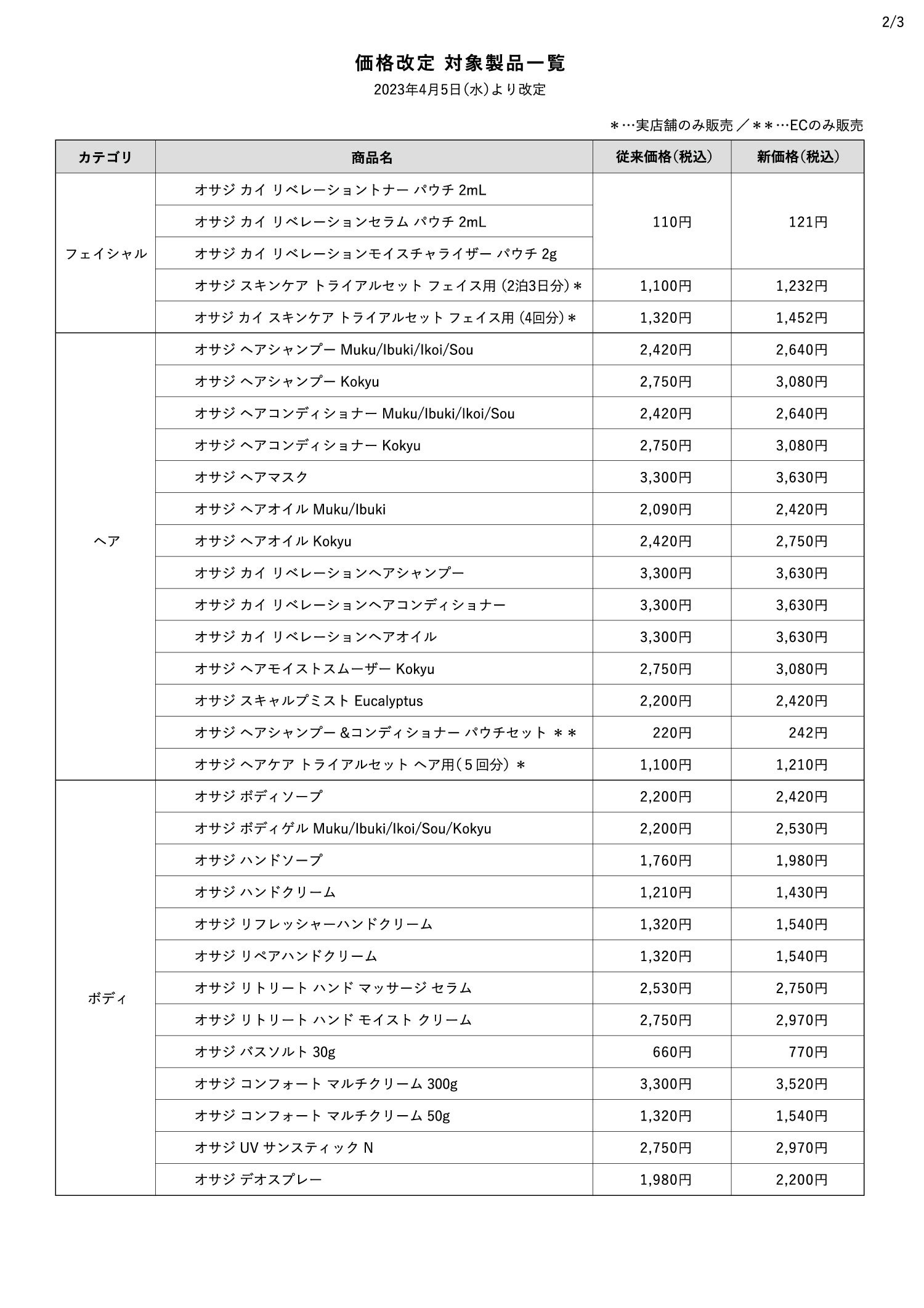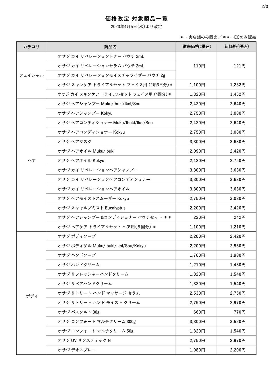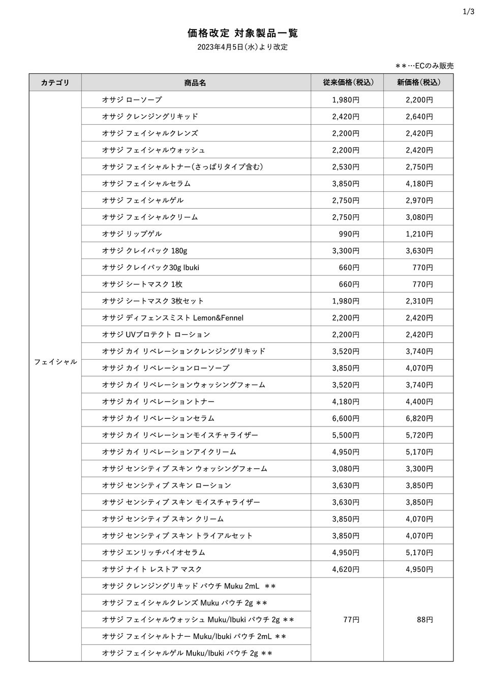 健やかで美しい皮膚を保つためのスキンケアライフスタイルを提案する敏感肌ブランドOSAJI(オサジ)を展開する日東電化工業株式会社 (本社:群馬県高崎市 代表取締役 茂田 亮平)は、2023年4月5日(水)より定番アイテムの価格を改定いたします。