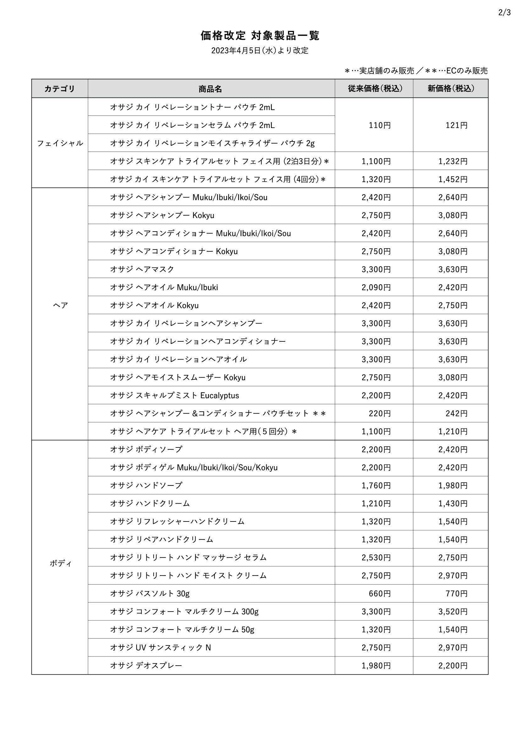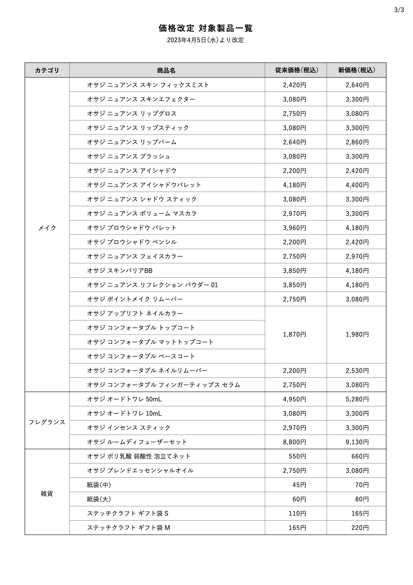 OSAJI(オサジ)定番アイテム価格改定のご案内
